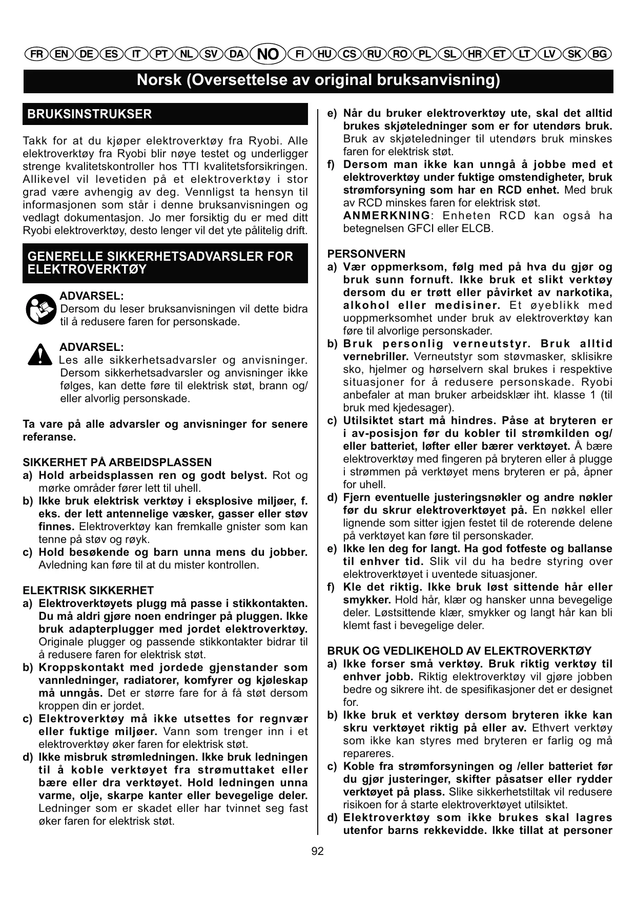 Norsk (Oversettelse av original bruksanvisning) BRUKSINSTRUKSER e) Når du bruker elektroverktøy ute, skal det alltid brukes skjøteledninger som er for utendørs bruk. Bruk av skjøteledninger til utendørs bruk minskes faren for elektrisk støt. f) Dersom man ikke kan unngå å jobbe med et elektroverktøy under fuktige omstendigheter, bruk strømforsyning som har en RCD enhet. Med bruk av RCD minskes faren for elektrisk støt. ANMERKNING: Enheten RCD kan også ha betegnelsen GFCI eller ELCB. Takk for at du kjøper elektroverktøy fra Ryobi. Alle elektroverktøy fra Ryobi blir nøye testet og underligger strenge kvalitetskontroller hos TTI kvalitetsforsikringen. Allikevel vil levetiden på et elektroverktøy i stor grad være avhengig av deg. Vennligst ta hensyn til informasjonen som står i denne bruksanvisningen og vedlagt dokumentasjon. Jo mer forsiktig du er med ditt Ryobi elektroverktøy, desto lenger vil det yte pålitelig drift. PERSONVERN a) Vær oppmerksom, følg med på hva du gjør og bruk sunn fornuft. Ikke bruk et slikt verktøy dersom du er trøtt eller påvirket av narkotika, a l k o h o l el l er med i s i n er. E t ø y eblikk med uoppmerksomhet under bruk av elektroverktøy kan føre til alvorlige personskader. b) B r u k p e r s o n l i g v e r n e u t s t y r. B r u k a l l t i d vernebriller. Verneutstyr som støvmasker, sklisikre sko, hjelmer og hørselvern skal brukes i respektive situasjoner for å redusere personskade. Ryobi anbefaler at man bruker arbeidsklær iht. klasse 1 (til bruk med kjedesager). c) Utilsiktet start må hindres. Påse at bryteren er i av-posisjon før du kobler til strømkilden og/ eller batteriet, løfter eller bærer verktøyet. Å bære elektroverktøy med fingeren på bryteren eller å plugge i strømmen på verktøyet mens bryteren er på, åpner for uhell. d) Fjern eventuelle justeringsnøkler og andre nøkler før du skrur elektroverktøyet på. En nøkkel eller lignende som sitter igjen festet til de roterende delene på verktøyet kan føre til personskader. e) Ikke len deg for langt. Ha god fotfeste og ballanse til enhver tid. Slik vil du ha bedre styring over elektroverktøyet i uventede situasjoner. f) Kle det riktig. Ikke bruk løst sittende hår eller smykker. Hold hår, klær og hansker unna bevegelige deler. Løstsittende klær, smykker og langt hår kan bli klemt fast i bevegelige deler.