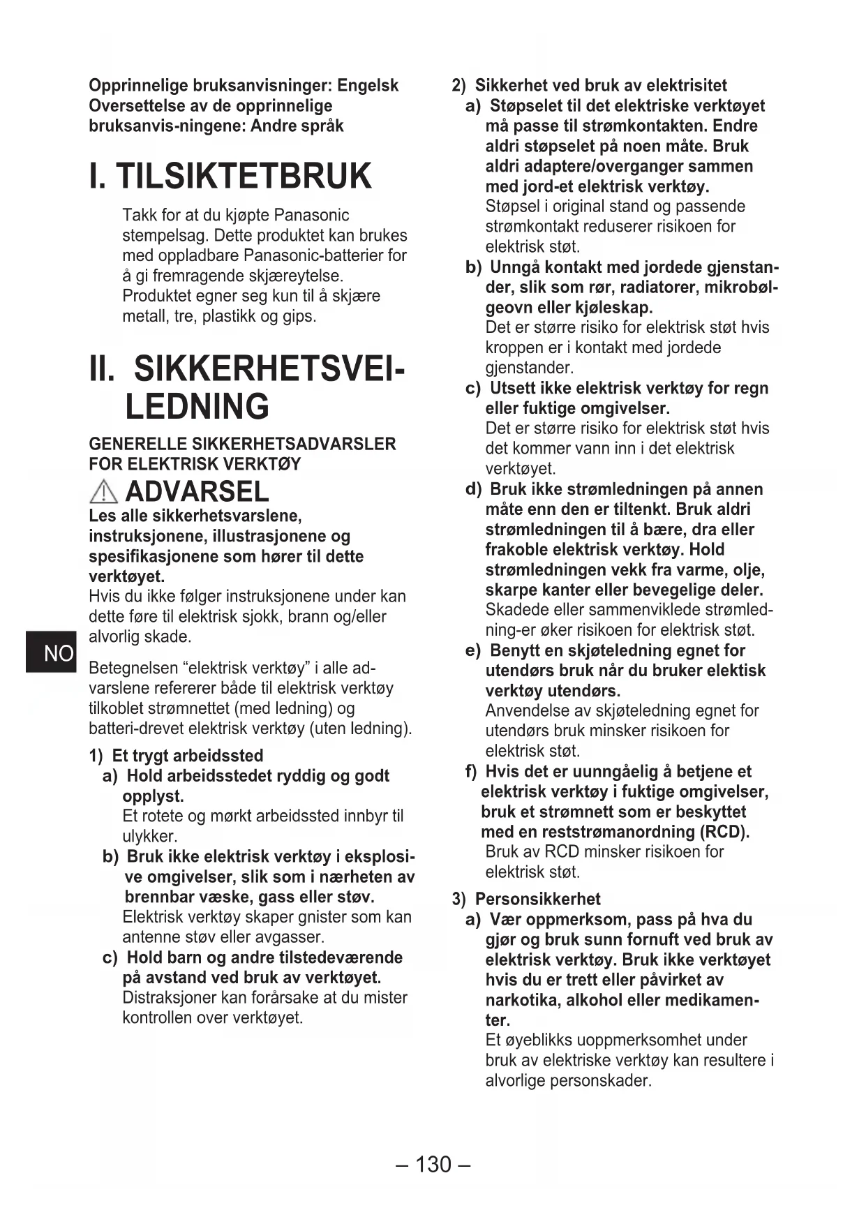 Takk for at du kjøpte Panasonic stempelsag. Dette produktet kan brukes med oppladbare Panasonic-batterier for å gi fremragende skjæreytelse. Produktet egner seg kun til å skjære metall, tre, plastikk og gips.