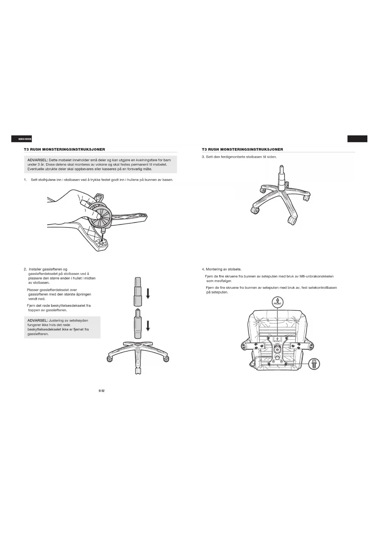 B51 52 ADVARSEL: Dette møbelet inneholder små deler og kan utgjøre en kvelningsfare for barn under 3 år. Disse delene skal monteres av voksne og skal festes permanent til møbelet. Eventuelle ubrukte deler skal oppbevares eller kasseres på en forsvarlig måte. ADVARSEL: Justering av setehøyden fungerer ikke hvis det røde beskyttelsesdekselet ikke er fjernet fra gassløfteren.