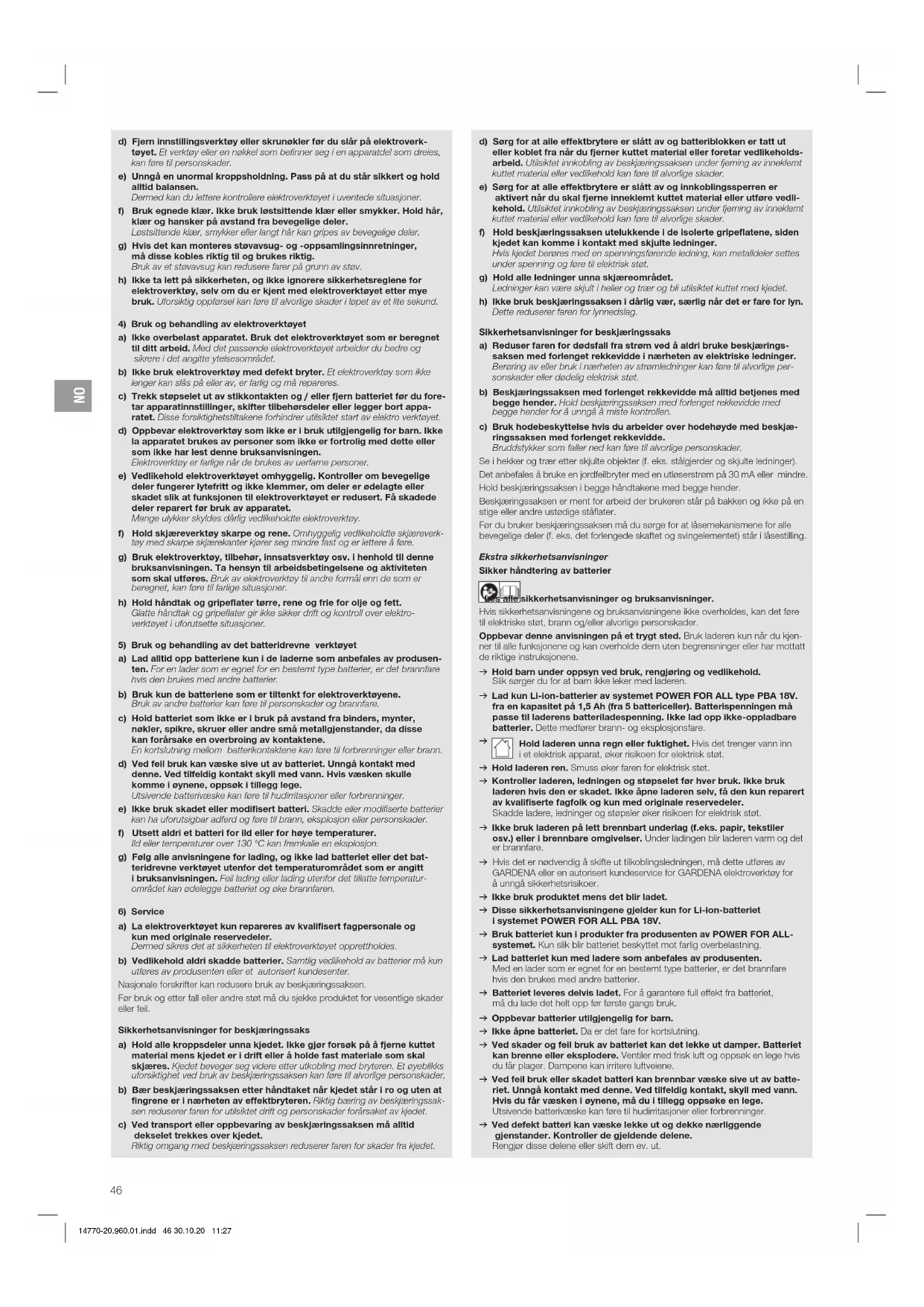 Hold laderen unna regn eller fuktighet. Hvis det trenger vann inn iet elektrisk apparat, øker risikoen for elektrisk støt. v Hold laderen ren. Smuss øker faren for elektrisk støt. v Kontroller laderen, ledningen og støpselet før hver bruk. Ikke bruk laderen hvis den er skadet. Ikke åpne laderen selv, få den kun reparert av kvalifiserte fagfolk og kun med originale reservedeler. Skadde ladere, ledninger og støpsler øker risikoen for elektrisk støt. v Ikke bruk laderen på lett brennbart underlag (f.eks. papir, tekstiler osv.) eller i brennbare omgivelser. Under ladingen blir laderen varm og det er brannfare. v Hvis det er nødvendig å skifte ut tilkoblingsledningen, må dette utføres av GARDENA eller en autorisert kundeservice for GARDENA elektroverktøy for å unngå sikkerhetsrisikoer. v Ikke bruk produktet mens det blir ladet. v Disse sikkerhetsanvisningene gjelder kun for Li-ion-batteriet isystemet POWER FOR ALL PBA 18V. v Bruk batteriet kun i produkter fra produsenten av POWER FOR ALL- systemet. Kun slik blir batteriet beskyttet mot farlig overbelastning. v Lad batteriet kun med ladere som anbefales av produsenten. Med en lader som er egnet for en bestemt type batterier, er det brannfare hvis den brukes med andre batterier. v Batteriet leveres delvis ladet. For å garantere full effekt fra batteriet, må du lade det helt opp før første gangs bruk. v Oppbevar batterier utilgjengelig for barn. v Ikke åpne batteriet. Da er det fare for kortslutning. v Ved skader og feil bruk av batteriet kan det lekke ut damper. Batteriet kan brenne eller eksplodere. Ventiler med frisk luft og oppsøk en lege hvis du får plager. Dampene kan irritere luftveiene. v Ved feil bruk eller skadet batteri kan brennbar væske sive ut av batte- riet. Unngå kontakt med denne. Ved tilfeldig kontakt, skyll med vann. Hvis du får væsken i øynene, må du i tillegg oppsøke en lege. Utsivende batterivæske kan føre til hudirritasjoner eller forbrenninger. v Ved defekt batteri kan væske lekke ut og dekke nærliggende gjenstander. Kontroller de gjeldende delene. Rengjør disse delene eller skift dem ev. ut. 14770-20.960.01.indd 46 30.10.20 11:27NO