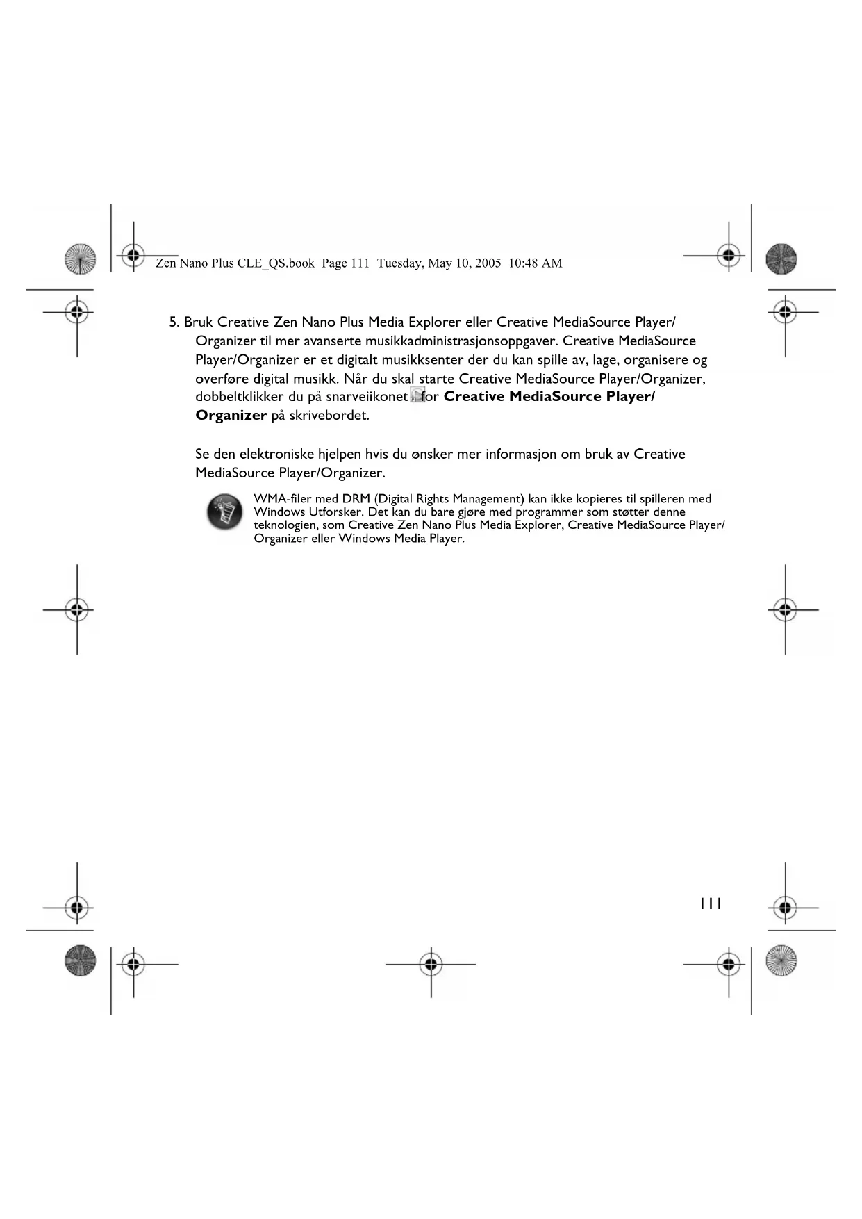 Organizer til mer avanserte musikkadministrasjonsoppgaver. Creative MediaSource Player/Organizer er et digitalt musikksenter der du kan spille av, lage, organisere og overføre digital musikk. Når du skal starte Creative MediaSource Player/Organizer, dobbeltklikker du på snarveiikonet for Creative MediaSource Player/ Organizer på skrivebordet. Se den elektroniske hjelpen hvis du ønsker mer informasjon om bruk av Creative MediaSource Player/Organizer. WMA-filer med DRM (Digital Rights Management) kan ikke kopieres til spilleren med Windows Utforsker. Det kan du bare gjøre med programmer som støtter denne teknologien, som Creative Zen Nano Plus Media Explorer, Creative MediaSource Player/ Organizer eller Windows Media Player. Zen Nano Plus CLE_QS.book Page 111 Tuesday, May 10, 2005 10:48 AM112