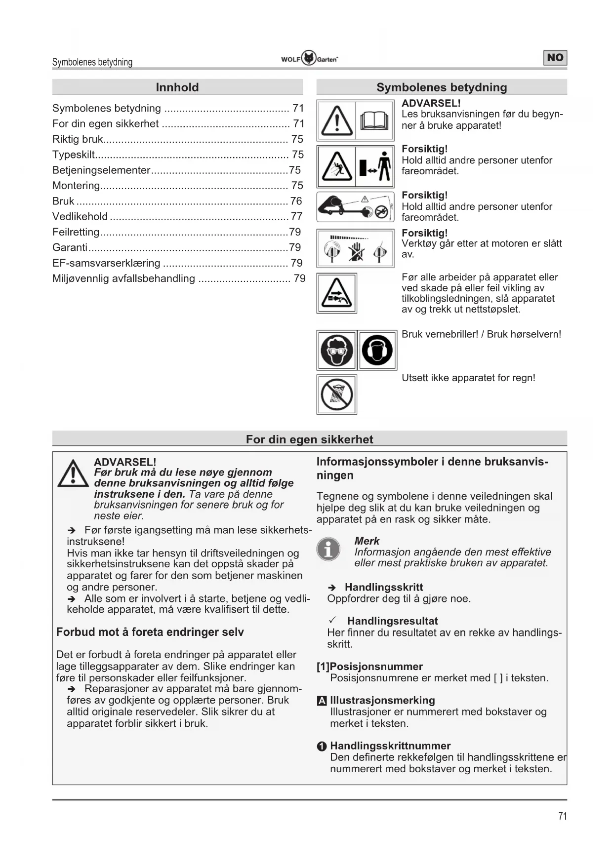 For din egen sikkerhet Farenivåer for advarslene I denne bruksanvisningen benyttes følgende fare- nivåer for å beskrive mulige faresituasjoner: FARE! Den farlige situasjonen er nært forestående og kan medføre lette personskader og helt til død hvis tiltakene ikke følges. ADVARSEL! (QIDUOLJVLWXDVMRQNDQLQQWUHႇHRJNDQ medføre alvorlige personskader og død hvis tiltakene ikke blir fulgt. FORSIKTIG! 'HQIDUOLJHVLWXDVMRQHQNDQLQQWUHႇHRJ kan medføre lette personskader hvis tiltakene ikke følges. Obs! Det kan oppstå en potensielt skadelig situasjon som hvis den ikke unngås, kan føre til materielle skader. Oppbygging av sikkerhetsinstrukser FARE! Faretype og -kilde! ÂFølger ved neglisjering ¾ Tiltak for å avverge fare Beskyttelse av deg selv og andre ¾ Dette apparatet må ikke brukes av barn under 16 år eller personer som har nedsatte kroppslige, sensoriske eller sjelelige evner eller manglende erfaring og kunnskaper. Heller ikke personer som ikke er fortrolige med bruksanvisningen, skal bruke apparatet. Det kan være lokale forskrifter som fastsetter minstealder for brukeren. ¾ Av sikkerhetsmessige hensyn må plentrimmeren ikke brukes av barn mindre enn 16 år eller personer som ikke har lest bruksanvisningen. Lokale bestemmelser kan fastlegge brukerens laveste alder. ¾ ,NNHWDLEUXNSOHQWULPPHUHQKYLVGHWEH¿QQHU seg personer (spesielt barn) eller dyr i umiddelbar nærhet. Påse at barn ikke leker med plentrimmeren. ¾ Avbryt bruken av maskinen hvis du merker at GHWEH¿QQHUVHJSHUVRQHUVSHVLHOWEDUQHOOHU dyr i nærheten. ¾ Du må ikke slå på motoren når føttene eller hendene dine er i nærheten av kutteinnretningen. ¾ Skill alltid maskinen fra strømmen når den forlates uten tilsyn og ved fjerning av blokkeringer. ¾ Når du arbeider med eller ved plentrimmeren må du alltid bruke lukkete sko og langbukser og annet egnet personlig verneutstyr (vernebriller, hørselsvern, arbeidshansker osv.) Hvis man bruker personlig verneutstyr, reduseres faren for skader. Unngå å bruke vide klær som kan fanges av kutteverktøyet. Før bruk ¾ Før bruk må du gjøre deg kjent med plentrimmeren, dens funksjoner og betjeningselementer. ¾ Monter ikke kuttelementer av metall. ¾ Ikke bruk plentrimmere som har en defekt bryter, eller som ikke lenger kan slås av eller på./DGLVVHVNDGHQHUHSDUHUHVDYNYDOL¿VHUW fagkraft eller fagverksted. ¾ Skadd kabel må ikke kobles til strømforsyningen. Ta ikke på skadd kabel før den skilles fra strømforsyningen. Skadde kabler kan før til berøring av deler som står under spenning. ¾ Bruk aldri apparatet med skadde eller manglende verneinnretninger eller deksler. /DGLVVHVNDGHQHUHSDUHUHVDYNYDOL¿VHUWIDJNUDIW eller fagverksted.For din egen sikkerhet SikkerhetsinstrukserFor din egen sikkerhet