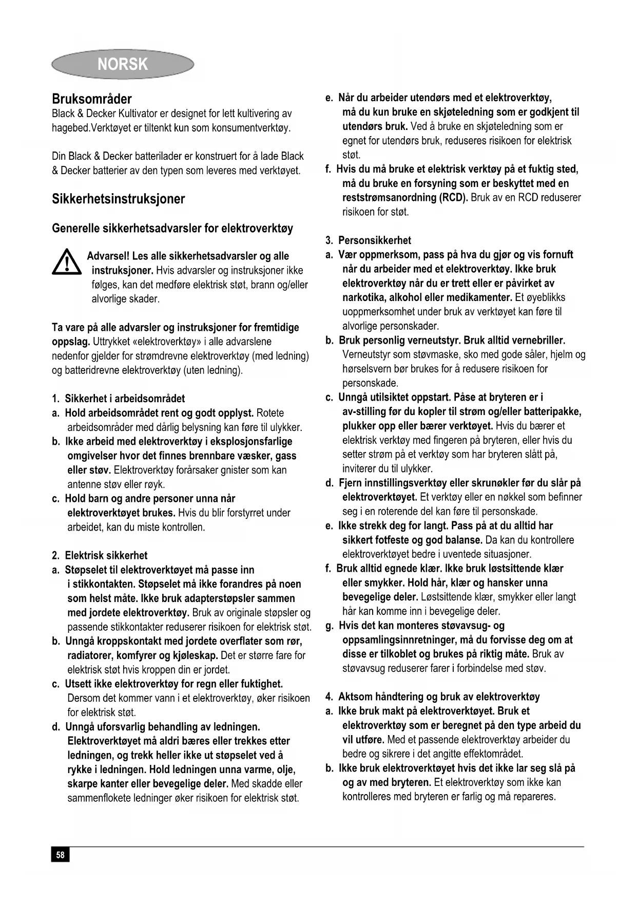 Kevin Hewitt Adm. dir. for forbrukerteknikk Spennymoor, County Durham DL16 6JG, Storbritannia 23-3-2009 Reservdeler / reparasjoner Reservdeler kan kjøpes hos autoriserte Black & Decker serviceverksteder, som også gir kostnadsoverslag og reparerer våre produkter. Oversikt over våre autoriserte serviceverksteder finnes på Internet, vår hjemmeside www.blackanddecker.no samt www.2helpU.com Garanti Black & Decker garanterer at produktet ikke har material- og/ eller fabrikasjonsfeil ved levering til kunde. Garantien er i tillegg til kundens lovlige rettigheter og påvirker ikke disse. Garantien gjelder innen medlemsstatene i den Europeiske Unionen og i det Europeiske Frihandelsområdet. Hvis et Black & Decker produkt går i stykker på grunn av material- og/eller fabrikasjonsfeil eller har mangler i forhold til spesifikasjonene, innen 24 måneder fra kjøpet, påtar Black & Decker seg å reparere eller bytte ut produktet med minst mulig vanskelighet for kunden. Garantien gjelder ikke for feil som kommer av: normal slittasje feilaktig bruk eller vedlikehold (mislighold) at produktet har blitt skadet av fremmede gjenstander, emner eller ved et uhell Det gjøres oppmerksom på at produktet ikke er beregnet på industriell/profesjonell/yrkesmessig bruk, men til hus- og hjemmebruk. Garantien gjelder ikke om reparasjoner har blitt utført av noen andre enn et autorisert Black & Decker serviceverksted. For å ta garantien i bruk skal produktet og kjøpekvittering leveres til forhandleren eller til et autorisert serviceverksted senest 2 måneder etter at feilen har blitt oppdaget. For informasjon om nærmeste autoriserte serviceverksted; kontakt det lokale Black & Decker kontoret på den adressen som er angitt i bruksanvisningen. En oversikt over alle autoriserte serviceverksteder samt servicevilkår finnes også tilgjengelig på Internet, adresse: www.2helpU.com Vennligst stikk innom våre nettsider på www.blackanddecker.no for å registrere ditt nye Black & Decker-produkt og for å holde deg oppdatert om nye produkter og spesialtilbud. Du finner mer informasjon om Black & Decker og produktutvalget vårt på www.blackanddecker.no64 DANSK Anvendelsesområde Din Black & Decker kultivator er designet til let vedligeholdelse af havebede.Værktøjet er kun beregnet til privat brug. Black & Decker laderen er designet til opladning af samme Black & Decker batterier, som leveres med dette værktøj. Sikkerhedsinstruktioner Generelle sikkerhedsadvarsler for værktøjet