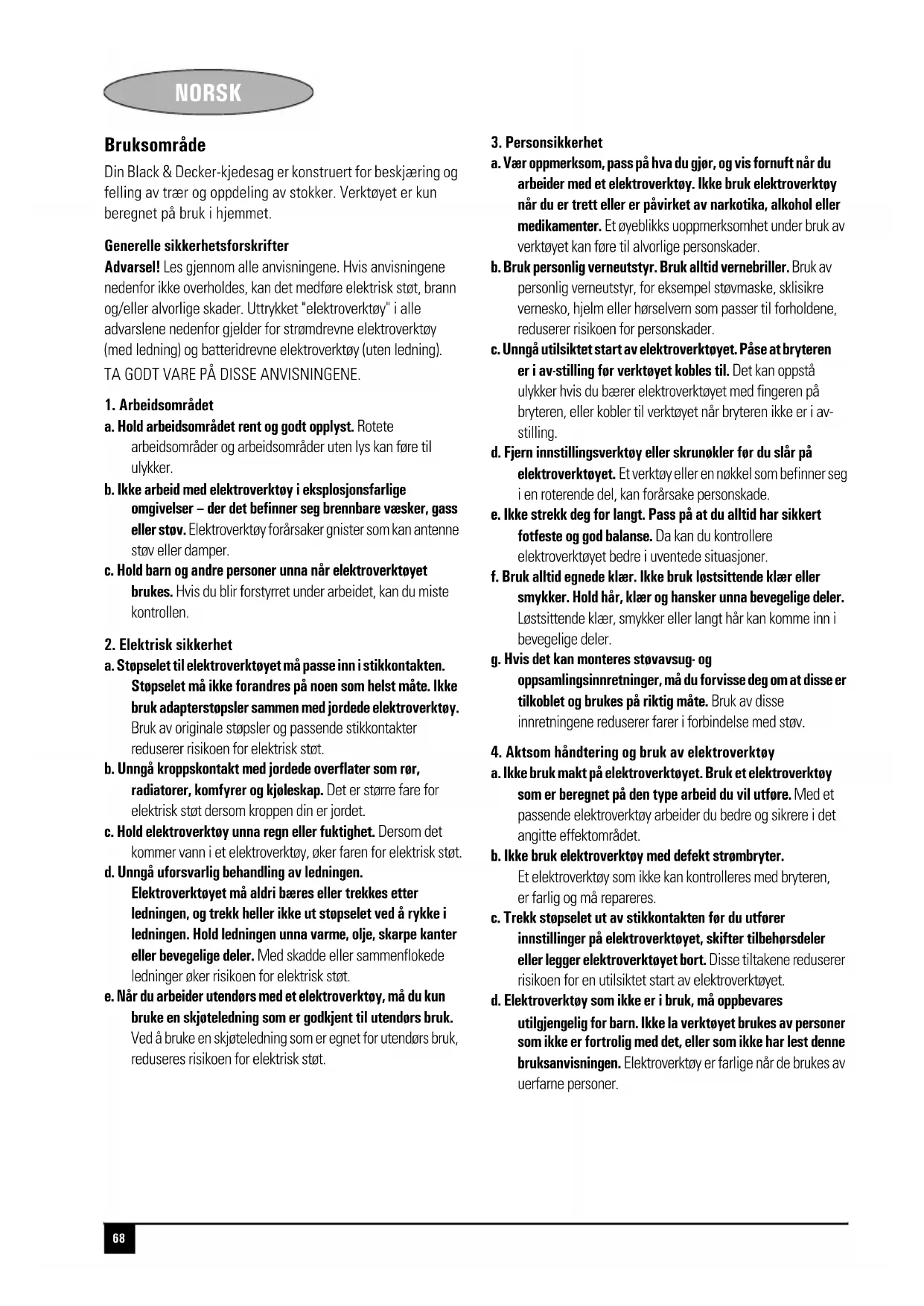 Vikt (kg.) 5.55 5.65 5.8 5.6 5.7 5.85 Skydds- klass II II II II II II68 NORSK NORSK Bruksområde Din Black & Decker-kjedesag er konstruert for beskjæring og felling av trær og oppdeling av stokker. Verktøyet er kun beregnet på bruk i hjemmet. Generelle sikkerhetsforskrifter Advarsel! Les gjennom alle anvisningene. Hvis anvisningene nedenfor ikke overholdes, kan det medføre elektrisk støt, brann og/eller alvorlige skader. Uttrykket "elektroverktøy" i alle advarslene nedenfor gjelder for strømdrevne elektroverktøy (med ledning) og batteridrevne elektroverktøy (uten ledning). TA GODT VARE PÅ DISSE ANVISNINGENE.