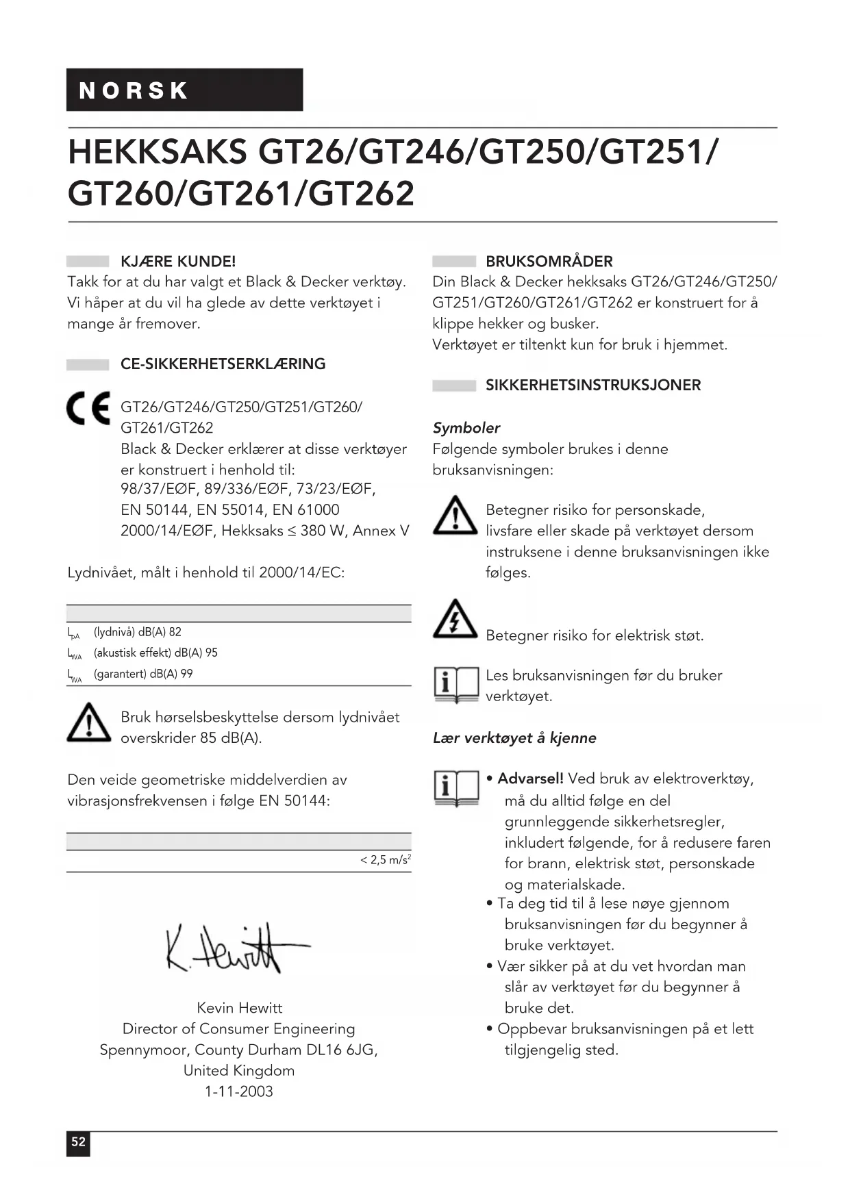 Kevin Hewitt Director of Consumer Engineering Spennymoor, County Durham DL16 6JG, United Kingdom 1-11-2003 BRUKSOMRÅDER Din Black & Decker hekksaks GT26/GT246/GT250/ GT251/GT260/GT261/GT262 er konstruert for å klippe hekker og busker. Verktøyet er tiltenkt kun for bruk i hjemmet. SIKKERHETSINSTRUKSJONER Symboler Følgende symboler brukes i denne bruksanvisningen: Betegner risiko for personskade, livsfare eller skade på verktøyet dersom instruksene i denne bruksanvisningen ikke følges. Betegner risiko for elektrisk støt. Les bruksanvisningen før du bruker verktøyet. Lær verktøyet å kjenne