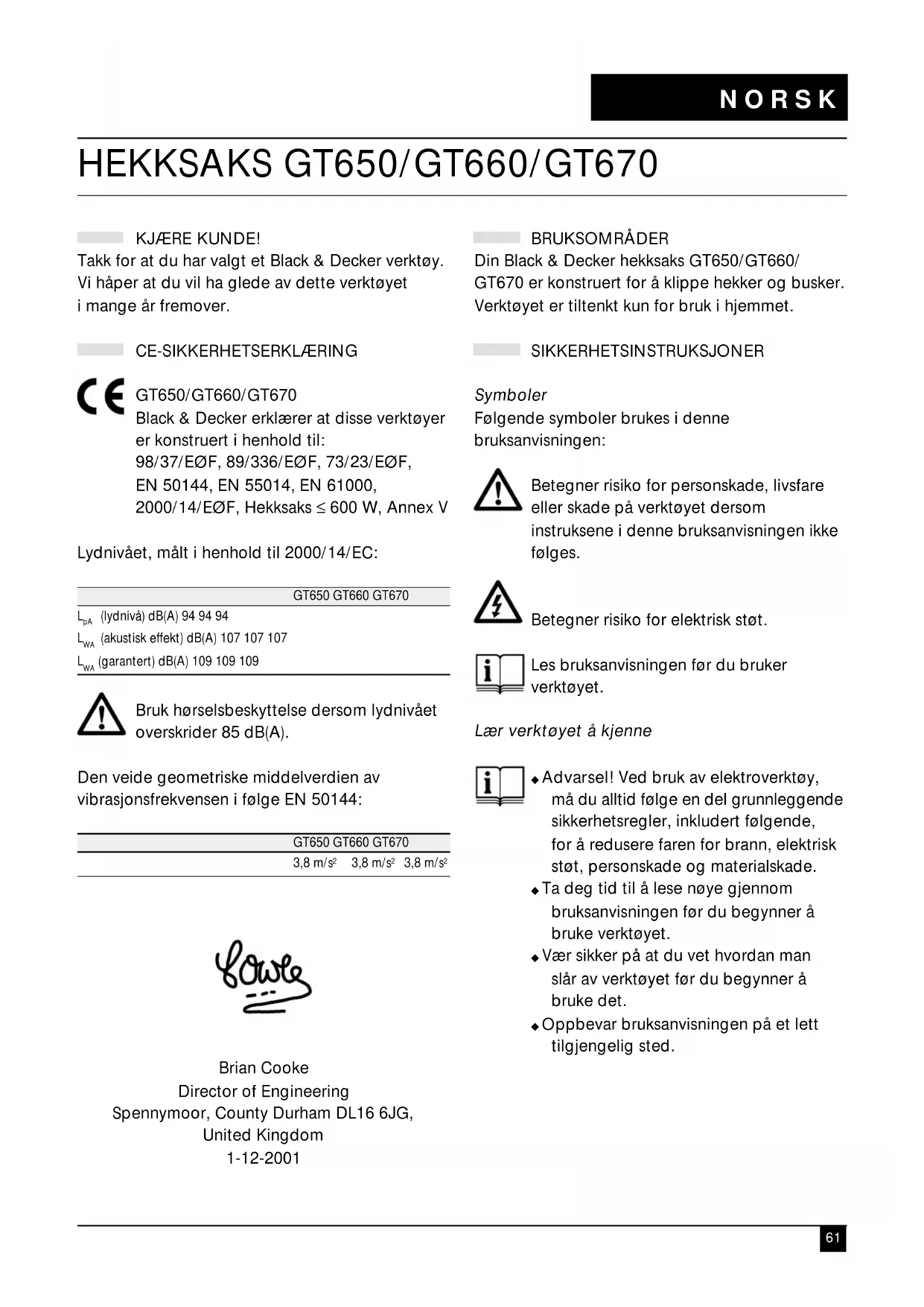 Brian Cooke Director of Engineering Spennymoor, County Durham DL16 6JG, United Kingdom 1-12-2001 BRUKSOMRÅDER Din Black & Decker hekksaks GT650/GT660/ GT670 er konstruert for å klippe hekker og busker. Verktøyet er tiltenkt kun for bruk i hjemmet. SIKKERHETSINSTRUKSJONER Symboler Følgende symboler brukes i denne bruksanvisningen: Betegner risiko for personskade, livsfare eller skade på verktøyet dersom instruksene i denne bruksanvisningen ikke følges. Betegner risiko for elektrisk støt. Les bruksanvisningen før du bruker verktøyet. Lær verktøyet å kjenne ◆ Advarsel! Ved bruk av elektroverktøy, må du alltid følge en del grunnleggende sikkerhetsregler, inkludert følgende, for å redusere faren for brann, elektrisk støt, personskade og materialskade. ◆ Ta deg tid til å lese nøye gjennom bruksanvisningen før du begynner å bruke verktøyet. ◆ Vær sikker på at du vet hvordan man slår av verktøyet før du begynner å bruke det. ◆ Oppbevar bruksanvisningen på et lett tilgjengelig sted.62 NORSK Generelt