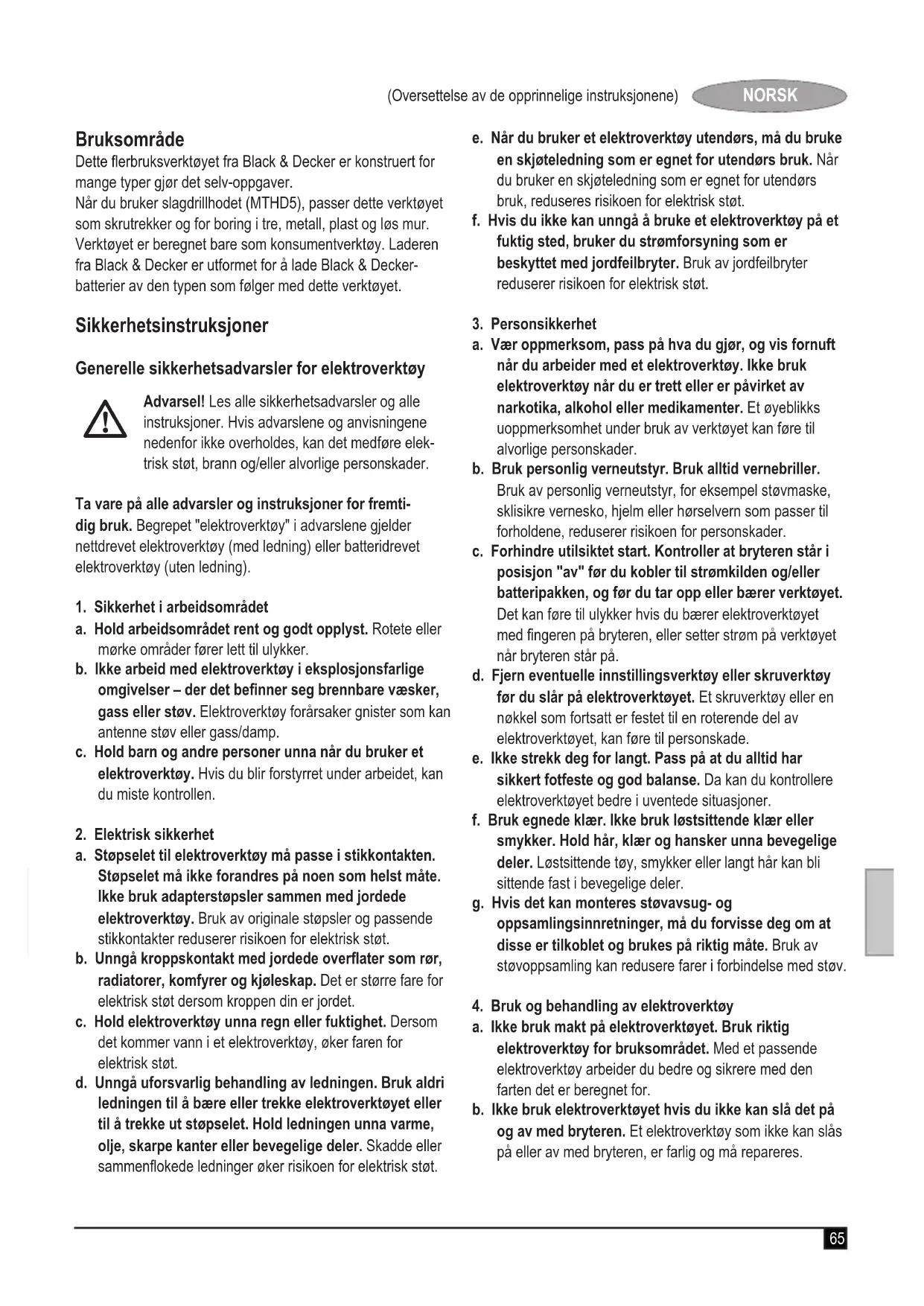 Advarsel! Les alle sikkerhetsadvarsler og alle instruksjoner. Hvis advarslene og anvisningene nedenfor ikke overholdes, kan det medføre elek- trisk støt, brann og/eller alvorlige personskader. Ta vare på alle advarsler og instruksjoner for fremti- dig bruk. Begrepet "elektroverktøy" i advarslene gjelder nettdrevet elektroverktøy (med ledning) eller batteridrevet elektroverktøy (uten ledning).