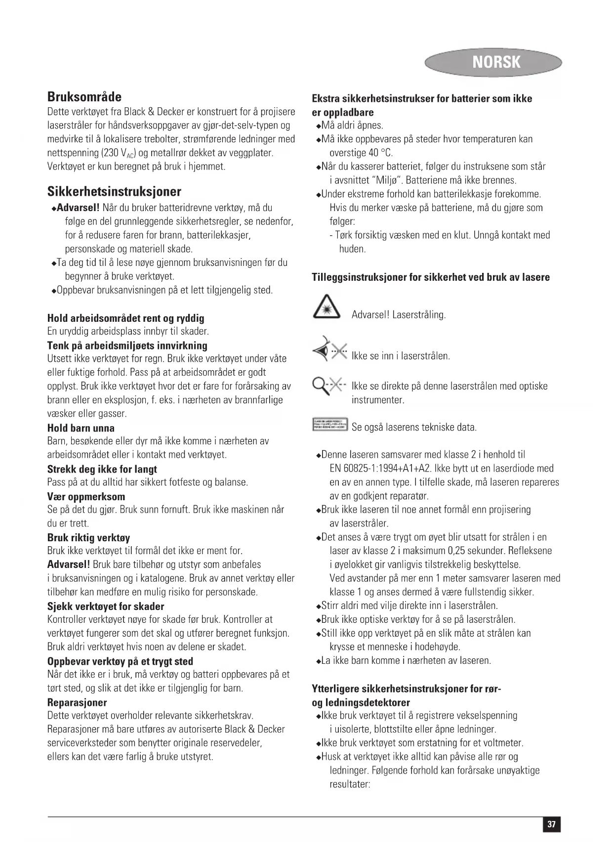 ) og metallrør dekket av veggplater. Verktøyet er kun beregnet på bruk i hjemmet. Sikkerhetsinstruksjoner ◆ Advarsel! Når du bruker batteridrevne verktøy, må du følge en del grunnleggende sikkerhetsregler, se nedenfor, for å redusere faren for brann, batterilekkasjer, personskade og materiell skade. ◆ Ta deg tid til å lese nøye gjennom bruksanvisningen før du begynner å bruke verktøyet. ◆ Oppbevar bruksanvisningen på et lett tilgjengelig sted. Hold arbeidsområdet rent og ryddig En uryddig arbeidsplass innbyr til skader. Tenk på arbeidsmiljøets innvirkning Utsett ikke verktøyet for regn. Bruk ikke verktøyet under våte eller fuktige forhold. Pass på at arbeidsområdet er godt opplyst. Bruk ikke verktøyet hvor det er fare for forårsaking av brann eller en eksplosjon, f. eks. i nærheten av brannfarlige væsker eller gasser. Hold barn unna Barn, besøkende eller dyr må ikke komme i nærheten av arbeidsområdet eller i kontakt med verktøyet. Strekk deg ikke for langt Pass på at du alltid har sikkert fotfeste og balanse. Vær oppmerksom Se på det du gjør. Bruk sunn fornuft. Bruk ikke maskinen når du er trett. Bruk riktig verktøy Bruk ikke verktøyet til formål det ikke er ment for. Advarsel! Bruk bare tilbehør og utstyr som anbefales i bruksanvisningen og i katalogene. Bruk av annet verktøy eller tilbehør kan medføre en mulig risiko for personskade. Sjekk verktøyet for skader Kontroller verktøyet nøye for skade før bruk. Kontroller at verktøyet fungerer som det skal og utfører beregnet funksjon. Bruk aldri verktøyet hvis noen av delene er skadet. Oppbevar verktøy på et trygt sted Når det ikke er i bruk, må verktøy og batteri oppbevares på et tørt sted, og slik at det ikke er tilgjenglig for barn. Reparasjoner Dette verktøyet overholder relevante sikkerhetskrav. Reparasjoner må bare utføres av autoriserte Black & Decker serviceverksteder som benytter originale reservedeler, ellers kan det være farlig å bruke utstyret. Ekstra sikkerhetsinstrukser for batterier som ikke er oppladbare ◆ Må aldri åpnes. ◆ Må ikke oppbevares på steder hvor temperaturen kan overstige 40 °C. ◆ Når du kasserer batteriet, følger du instruksene som står i avsnittet “Miljø”. Batteriene må ikke brennes. ◆ Under ekstreme forhold kan batterilekkasje forekomme. Hvis du merker væske på batteriene, må du gjøre som følger: - Tørk forsiktig væsken med en klut. Unngå kontakt med huden. Tilleggsinstruksjoner for sikkerhet ved bruk av lasere Advarsel! Laserstråling. Ikke se inn i laserstrålen. Ikke se direkte på denne laserstrålen med optiske instrumenter. Se også laserens tekniske data. ◆ Denne laseren samsvarer med klasse 2 i henhold til EN 60825-1:1994+A1+A2. Ikke bytt ut en laserdiode med en av en annen type. I tilfelle skade, må laseren repareres av en godkjent reparatør. ◆ Bruk ikke laseren til noe annet formål enn projisering av laserstråler. ◆ Det anses å være trygt om øyet blir utsatt for strålen i en laser av klasse 2 i maksimum 0,25 sekunder. Refleksene i øyelokket gir vanligvis tilstrekkelig beskyttelse. Ved avstander på mer enn 1 meter samsvarer laseren med klasse 1 og anses dermed å være fullstendig sikker. ◆ Stirr aldri med vilje direkte inn i laserstrålen. ◆ Bruk ikke optiske verktøy for å se på laserstrålen. ◆ Still ikke opp verktøyet på en slik måte at strålen kan krysse et menneske i hodehøyde. ◆ La ikke barn komme i nærheten av laseren. Ytterligere sikkerhetsinstruksjoner for rør- og ledningsdetektorer ◆ Ikke bruk verktøyet til å registrere vekselspenning i uisolerte, blottstilte eller åpne ledninger. ◆ Ikke bruk verktøyet som erstatning for et voltmeter. ◆ Husk at verktøyet ikke alltid kan påvise alle rør og ledninger. Følgende forhold kan forårsake unøyaktige resultater:38 NORSK - Lavt batteri - Tykke vegger med tynne rør eller ledninger - Svært tykke vegger - Svært dyptliggende ledninger eller rør - Vegger dekket av metall - Svært fuktige forhold - Skjermede ledninger ◆ Før bruk må du alltid teste verktøyet ved å prøve det ut et sted der du vet det ligger rør eller ledninger. ◆ Hvis du er i tvil, må du kontakte en kvalifisert byggentreprenør. Advarsel! Dette verktøyet kan ikke oppdage ledninger i kretser adskilt fra nettstrømtilførselen, kabler med likestrøm (DC) eller kabler for telekommunikasjons- eller datasystemer. Skjulte ledninger (for eksempel til lampetter) oppdages muligens ikke hvis bryteren er slått av. Advarsel! Dette verktøyet kan bare oppdage metallrør, ikke rør av annet materiale. Funksjoner