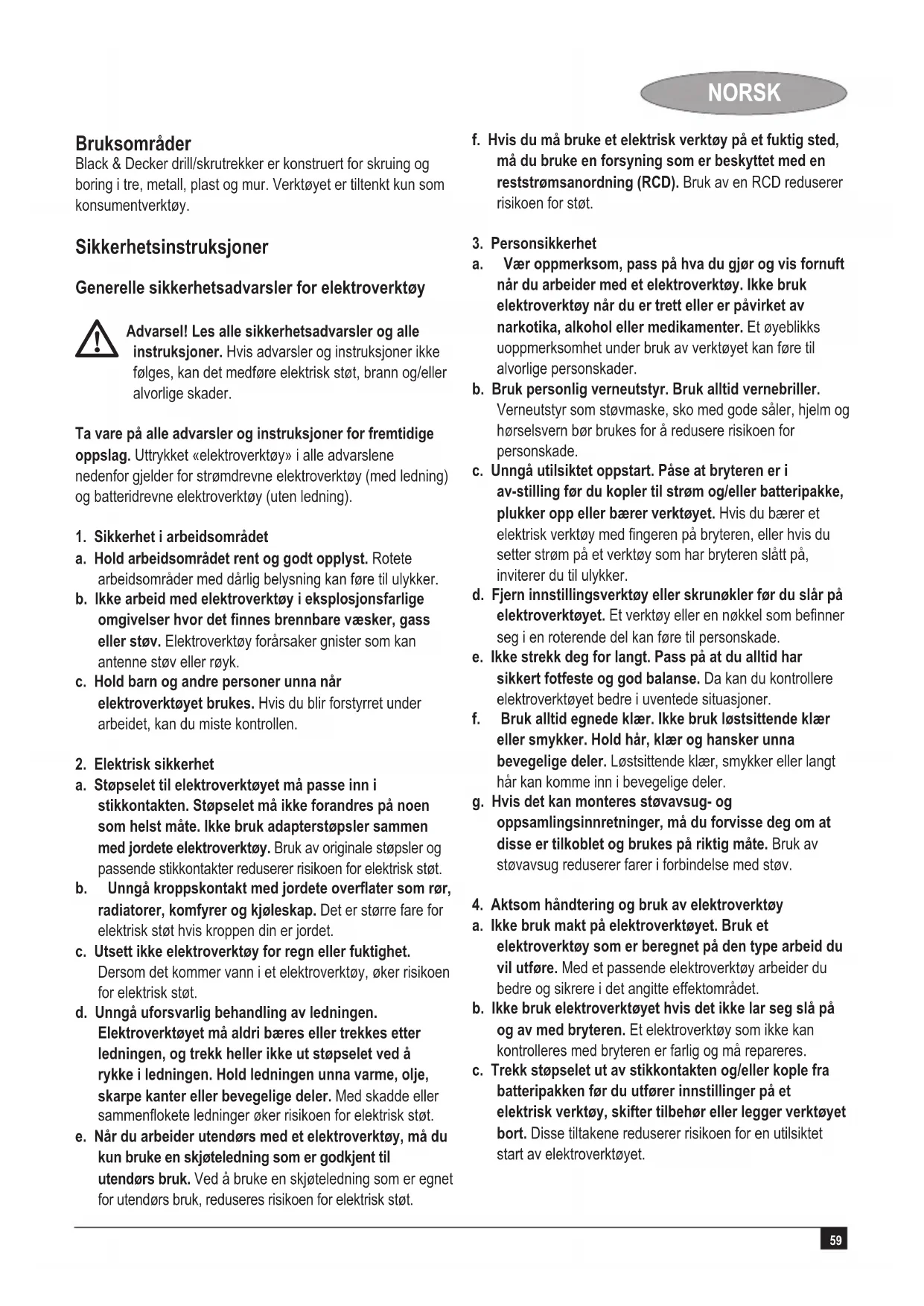 a. Ikke bruk makt på elektroverktøyet. Bruk et elektroverktøy som er beregnet på den type arbeid du vil utføre. Med et passende elektroverktøy arbeider du bedre og sikrere i det angitte effektområdet. b. Ikke bruk elektroverktøyet hvis det ikke lar seg slå på og av med bryteren. Et elektroverktøy som ikke kan kontrolleres med bryteren er farlig og må repareres. c. Trekk støpselet ut av stikkontakten og/eller kople fra batteripakken før du utfører innstillinger på et elektrisk verktøy, skifter tilbehør eller legger verktøyet bort. Disse tiltakene reduserer risikoen for en utilsiktet start av elektroverktøyet.60 NORSK d. Elektroverktøy som ikke er i bruk må oppbevares utilgjengelig for barn. Ikke la verktøyet brukes av personer som ikke er fortrolig med det eller som ikke har lest disse bruksanvisningene. Elektroverktøy er farlige når de brukes av uerfarne personer. e. Værnøyemedvedlikeholdavelektroverktøy. Kontroller om bevegelige deler fungerer feilfritt og ikke klemmes fast, om deler er brukket eller skadet og andre forhold som kan innvirke på elektroverktøyets funksjon. Hvis elektroverktøyet er skadet, må det repareres før bruk. Dårlig vedlikeholdte elektroverktøy er årsaken til mange uhell. f. Holdskjæreverktøyskarpeogrene. Godt vedlikeholdte skjæreverktøy med skarpe egger setter seg ikke så ofte fast og er lettere å føre. g. Bruk elektroverktøy, tilbehør, bor osv. i henhold til disse instruksjonene. Ta hensyn til arbeidsforholdene og arbeidet som skal utføres. Bruk av elektroverktøy til andre formål enn det som er angitt, kan føre til farlige situasjoner.