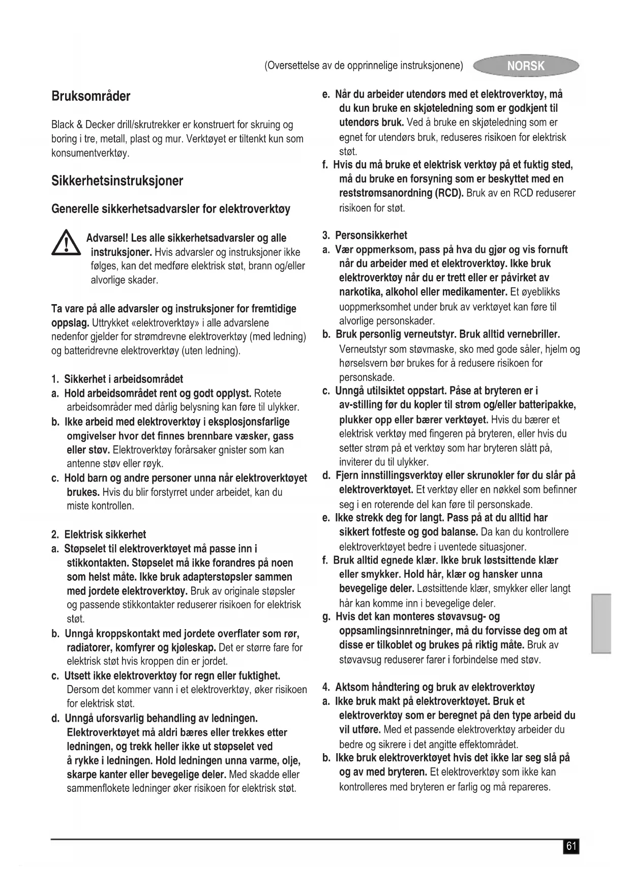 (Oversettelse av de opprinnelige instruksjonene) NORSK Reservdeler / reparasjoner Reservdeler kan kjøpes hos autoriserte Black & Decker serviceverksteder, som også gir kostnadsoverslag og reparerer våre produkter. Oversikt over våre autoriserte serviceverksteder nnes på Internet, vår hjemmeside www.blackanddecker.no samt www.2helpU.com Garanti Black & Decker garanterer at produktet ikke har material- og/ eller fabrikasjonsfeil ved levering til kunde. Garantien er i tillegg til kundens lovlige rettigheter og påvirker ikke disse. Garantien gjelder innen medlemsstatene i den Europeiske Unionen og i det Europeiske Frihandelsområdet. Hvis et Black & Decker produkt går i stykker på grunn av material- og/eller fabrikasjonsfeil eller har mangler i forhold til spesikasjonene, innen 24 måneder fra kjøpet, påtar Black & Decker seg å reparere eller bytte ut produktet med minst mulig vanskelighet for kunden. Garantien gjelder ikke for feil som kommer av: u normal slittasje u feilaktig bruk eller vedlikehold (mislighold) u at produktet har blitt skadet av fremmede gjenstander, emner eller ved et uhell Det gjøres oppmerksom på at produktet ikke er beregnet på industriell/profesjonell/yrkesmessig bruk, men til hus- og hjemmebruk. Garantien gjelder ikke om reparasjoner har blitt utført av noen andre enn et autorisert Black & Decker serviceverksted. For å ta garantien i bruk skal produktet og kjøpekvittering leveres til forhandleren eller til et autorisert serviceverksted senest 2 måneder etter at feilen har blitt oppdaget. For informasjon om nærmeste autoriserte serviceverksted; kontakt det lokale Black & Decker kontoret på den adressen som er angitt i bruksanvisningen. En oversikt over alle autoriserte serviceverksteder samt servicevilkår nnes også tilgjengelig på Internet, adresse: www.2helpU.com Vennligst stikk innom våre nettsider på www.blackanddecker.no for å registrere ditt nye Black & Decker-produkt og for å holde deg oppdatert om nye produkter og spesialtilbud. Du nner mer informasjon om Black & Decker og produktutvalget vårt på www.blackanddecker.no68 (Oversættelse af de oprindelige instruktioner) DANSK Anvendelsesområde Din Black & Decker boremaskine/skruetrækker er designet til bore- og skrueopgaver i træ, metal, plastik og blødt murværk. Værktøjet er kun beregnet til privat brug. Sikkerhedsinstruktioner Generelle sikkerhedsadvarsler for værktøjet