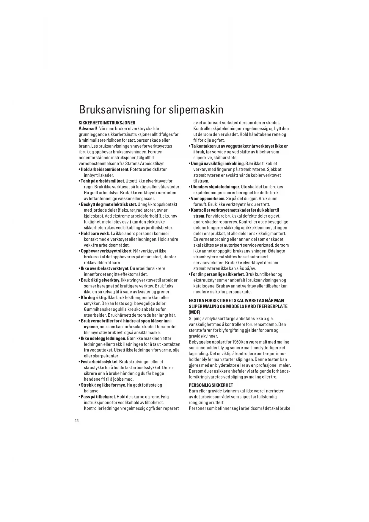(MDF) Sliping av blybasert farge anbefales ikke p.g.a. vanskelighet med å kontrollere forurenset damp. Den største faren for blyforgiftning gjelder for barn og gravide kvinner. Bebyggelse oppført før 1960 kan være malt med maling som inneholder bly og senere malt med ytterligere et lag maling. Det er viktig å kontrollere om fargen inne- holder bly før man starter slipingen. Denne testen kan gjøres med en blydetektor eller av en profesjonell maler. Dersom du er usikker anbefaler vi at følgende forhånds- forsikring ivaretas ved sliping av maling eller tre. PERSONLIG SIKKERHET Barn eller gravide kvinner skal ikke være i nærheten av det arbeidsområdet som slipes før fullstendig rengjøring er utført. Personer som befinner seg i arbeidsområdet skal bruke45 NORGE støvmaske. Filteret skal byttes ut hver dag eller med en gang brukeren føler vanskeligheter med å puste. Obs: Bruk kun støvmaske som er beregnet for arbeide med blyfarge eller gasser. Vanlige støvmasker har ikke samme beskyttelseseffekt. For å unngå å få i seg fargepartikler skal man ikke spise, drikke eller røyke i arbeidsområdet. Den personen som arbeider i slipeområdet skal gjøre rent og vaske seg skikkelig før man spiser, drikker eller røyker. Støv kan feste seg på mat, drikke etc. derfor skal ikke mat oppbevares i arbeidsområdet. MILJØ Maling skal fjernes på en slik måte at minst mulig mengde støv oppstår. Området der maling fjernes skal dekkes av plast. Sliping skal utføres på en slik måte at man reduserer risiko for malingsstøv utenfor arbeidsområdet.