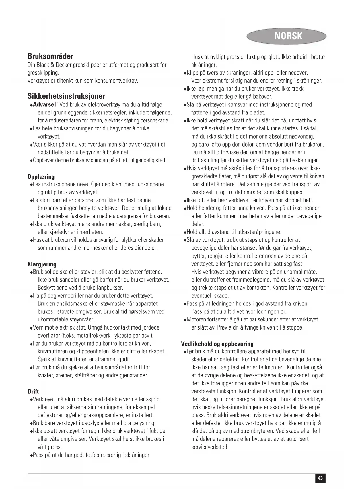 Montering Advarsel! Før monteringen må du passe på at apparatet er slått av, og at støpselet er trukket ut av kontakten. Montere håndtaket (fig. A) De nedre delene av håndtaket har flere monteringshuller, slik at du kan plassere håndtaket i en behagelig høyde under monteringshull. ◆ Sett de to nedre håndtakdelene (9) på øvre håndtak (4) ved hjelp av skruene (10), skivene (11) og mutrene (12), som vist. Montere håndtaket (fig. B) ◆ Sett endene av nedre håndtak (5) i tilhørende hull (13) i gressklipperen. ◆ Trykk håndtaket så langt ned det går.◆ Fest håndtaket ved hjelp av skruene (14). Feste kabelen (fig. C) Strømledningen må festes med kabelholdere. ◆ Sett den ene kabelholderen (15) på ledningen som går fra strømbryterboksen til motoren. Fest kabelholderen til det nedre håndtaket (5). ◆ Sett den andre kabelholderen (15) på ledningen som går fra strømbryterboksen til strømuttaket. Fest kabelholderen til det øvre håndtaket (4). Advarsel! Pass på at kabelen festes med kabelholderen før du setter støpslet i kontakten. Montere og sette på gressoppsamleren (fig. D1 og D2) ◆ Sett de to halvdelene til gressoppsamleren (6) inntil hverandre (fig. D1). ◆ Trykk de to halvdelene sammen.45 NORSK ◆ Løft klaffen (16) og sett gressoppsamleren over tappene (17) (fig. D2). Bruk Advarsel! La apparatet jobbe med sin egen hastighet. Ikke overbelast det. Justere klippehøyden (fig. E) Klippehøyden justeres ved å endre høyde på hjulene. Advarsel! Kople verktøyet fra strømtilførselen og vent til kniven har stanset før du går videre. ◆ Utløs hjulene (8) ved å dreie dem ut av låst posisjon. ◆ Still hjulene til ønsket høydeinnstilling. ◆ Drei hjulene tilbake til låst posisjon. Kontroller at alle hjulene er stilt til samme høyde. Start og stopp Slå på ◆ Hold med begge hender i håndtaket, og vipp det litt nedover, slik at forsiden av verktøyet løftes. ◆ Hold låseknappen (2) nede, og trekk strømbryteren (1) mot deg. ◆ Slipp låseknappen. ◆ Sett verktøyet tilbake i driftsposisjon. Slå av ◆ Slipp strømbryteren for å slå verktøyet av. Advarsel! Prøv aldri å låse en strømbryter i startstilling. Gressklipping (fig. F og G) Vi anbefaler at du bruker gressklipperen som forklart i denne delen for å oppnå optimale resultater og redusere risikoen for å klippe over strømledningen. ◆ Legg mesteparten av strømledningen på plenen, like ved startpunktet (posisjon 1 i fig. F). ◆ Slå på verktøyet, som forklart ovenfor. ◆ Fortsett som vist i fig. F: ◆ Gå fra posisjon 1 til posisjon 2. ◆ Snu mot høyre, og gå videre til posisjon 3. ◆ Snu mot venstre, og gå videre til posisjon 4. ◆ Gjenta fremgangsmåten ovenfor som nødvendig. Advarsel! Ikke gå mot ledningen, som vist i fig. G. Tømme gressoppsamleren ◆ Når du ser at det kommer løst gress under klipperen, er det på tide å tømme gressoppsamleren. Advarsel! Du må aldri bruke verktøyet uten gressoppsamler. Råd for optimalt resultat ◆ Hvis gresset er lengre enn omtrent 10 cm, bør du klippe det i to omganger. Klipp først med maksimal klippehøyde. Bruk deretter lav eller middels klippehøyde. ◆ Du oppnår optimale klipperesultater hvis du klipper gresset kun når det er tørt. Vedlikehold Ditt Black & Decker-apparat er konstruert for å være i drift over en lang periode med et minimum av vedlikehold. Med riktig vedlikehold og regelmessig rengjøring beholder apparatet ytelsen. ◆ Hold enheten ren og tørr. ◆ Rengjør ventilasjonsåpningene regelmessig med en ren, tørr malerkost. ◆ Bruk en butt skrape til å fjerne gress og smuss fra verktøyet. ◆ Bruk kun mild såpe og fuktig klut ved rengjøring av verktøyet. Pass på at det ikke kommer væske inn i verktøyet, og ikke dypp noen deler av verktøyet i væske. Ikke bruk slipende eller løsemiddelbaserte rengjøringsmidler. Vedlikehold av kniven ◆ Fjern gress og smuss fra kniven regelmessig. ◆ Kontroller tilstanden til kniven i begynnelsen av sommersesongen. ◆ Hvis kniven er svært sløvt, må du skjerpe eller bytte den. ◆ Hvis kniven er skadet eller slitt, monteres en ny kniv som forklart nedenfor. Bytte kniven (fig. H) Nye kniver kan kjøpes hos din Black & Decker forhandler. - GR298: Kat.-nr. A6244 - GR348: Kat.-nr. A6245 Advarsel! Følg følgende sikkerhetsregler: ◆ Kople verktøyet fra strømtilførselen og vent til kniven har stanset før du går videre. ◆ Vær forsiktig så du ikke skjærer deg. Bruk kraftige hansker eller en klut når du tar i kniven. ◆ Bruk kun kniv av spesifisert type. ◆ Du må aldri fjerne hjulet (18). Skifte ut kniven: ◆ Legg verktøyet over på siden. ◆ Ta tak i kniven (19) med den ene hånden. ◆ Løsne og fjern knivmutteren (20) ved hjelp av vedlagte skrunøkkel. ◆ Bytt kniven. ◆ Sett på skiven (om montert tidligere) og mutteren. ◆ Stram knivmutteren.46 NORSK Problemløsing Hvis verktøyet ikke ser ut til å fungere som det skal, følger du instruksjonene nedenfor. Hvis dette ikke løser problemet, kontakter du et autorisert Black & Decker serviceverksted. Advarsel! Før du går videre, må du trekke ut støpselet av kontakten. Motoren går, men kniven beveger seg ikke ◆ Fjern forsiktig alt som kan hindre kniven i å rotere. Ingen motorlyd, kniven beveger seg ikke ◆ Kontroller at strømledningen er riktig tilkoblet. ◆ Kontroller strømsikringene. Miljø Når verktøyet ditt er utslitt, beskytt naturen ved ikke å kaste det sammen med vanlig avfall. Lever det til en oppsamlingsplass som finnes i din kommune eller der hvor du kjøpte verktøyet. Tekniske data GR292 GR298 GR348 Spenning V 230 230 230 Inn-effekt W 800 900 1.000 Hastighet ubelastet min