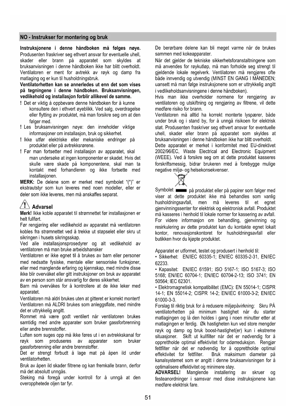 Jos valaistus ei toimi, tarkista että lamput on asennettu oikein paikoilleen ennen kuin otat yhteyttä tekniseen tukeen.51 NO - Instrukser for montering og bruk Instruksjonene i denne håndboken må følges nøye. Produsenten fraskriver seg ethvert ansvar for eventuelle uhell, skader eller brann på apparatet som skyldes at bruksanvisningen i denne håndboken ikke har blitt overholdt. Ventilatoren er ment for avtrekk av røyk og damp fra matlaging og er kun til husholdningsbruk. Ventilatorhetten kan se annerledes ut enn det som vises på tegningene i denne håndboken. Bruksanvisningen, vedlikehold og installasjon forblir allikevel de samme. ! Det er viktig å oppbevare denne håndboken for å kunne konsultere den i ethvert øyeblikk. Ved salg, overdragelse eller flytting av produktet, må man forsikre seg om at den følger med. ! Les bruksanvisningen nøye: den inneholder viktige informasjoner om installasjon, bruk og sikkerhet. ! Ikke utfør elektriske eller mekaniske endringer på produktet eller på avtrekksrørene. ! Før man fortsetter med installasjon av apparatet, skal man undersøke at ingen komponenter er skadet. Hvis det skulle være skade på komponentene, skal man ta kontakt med forhandleren og ikke fortsette med installasjonen. MERK: De delene som er merket med symbolet “(*)” er ekstrautstyr som kun leveres med noen modeller, eller er deler som ikke leveres, men må anskaffes separat. Advarsel Merk! Ikke koble apparatet til strømnettet før installasjonen er helt fullført. Før rengjøring eller vedlikehold av apparatet må ventilatoren kobles fra strømnettet ved å trekke ut støpselet eller skru ut sikringen i husets sikringsskap. Ved alle installasjonsprosedyrer og alt vedlikehold av ventilatoren må man bruke arbeidshansker Ventilatoren er ikke egnet til å brukes av barn eller personer med nedsatte fysiske, mentale eller sensoriske funksjoner, eller med manglende erfaring og kjennskap, med mindre disse ikke blir overvåket eller gitt instruksjoner om bruk av apparatet av en person som står ansvarlig for deres sikkerhet. Barn må overvåkes for å kontrollere at de ikke leker med apparatet. Ventilatoren må aldri brukes uten at gitteret er korrekt montert! Ventilatoren må ALDRI brukes som anleggsflate, med mindre det er uttrykkelig angitt. Rommet må være godt ventilert når ventilatoren brukes samtidig med andre apparater som bruker gassforbrenning eller andre brennstoffer. Luften som suges opp må ikke føres ut i en avtrekkskanal for røyk som produseres av apparater som bruker gassforbrenning eller andre brennstoffer. Det er strengt forbudt å lage mat på åpen ild under ventilatorhetten. Bruk av åpen ild skader filtrene og kan fremkalle brann, derfor må det absolutt unngås. Steking må foregå under kontroll for å unngå at den overopphetede oljen tar fyr. De berørbare delene kan bli meget varme når de brukes sammen med kokeapparater. Når det gjelder de tekniske sikkerhetsforanstaltningene som må anvendes for røykutløp, må man forholde seg strengt til gjeldende lokale regelverk. Ventilatoren må rengjøres ofte både innvendig og utvendig (MINST EN GANG I MÅNEDEN; uansett må man følge instruksjonene som er uttrykkelig angitt i vedlikeholdsanvisningene i denne håndboken). Hvis man ikke overholder normene for rengjøring av ventilatoren og utskiftning og rengjøring av filtrene, vil dette medføre risiko for brann. Ventilatoren må alltid ha korrekt monterte lyspærer, både under bruk og i stand by, for å unngå risikoen for elektrisk støt. Produsenten fraskriver seg ethvert ansvar for eventuelle uhell, skader eller brann på apparatet som skyldes at bruksanvisningen i denne håndboken ikke har blitt overholdt. Dette apparatet er merket i konformitet med EU-direktivet 2002/96/EC, Waste Electrical and Electronic Equipment (WEEE). Ved å forsikre seg om at dette produktet kasseres forskriftsmessig, bidrar brukeren med å forebygge mulige negative miljø- og helsekonsekvenser. Symbolet på produktet eller på papirer som følger med viser at dette produktet ikke må behandles som vanlig husholdningsavfall, men må leveres til et egnet gjenvinningssenter for elektrisk og elektronisk avfall. Produktet må kasseres i henhold til lokale normer for kassering av avfall. For videre informasjon om behandling, gjenvinning og resirkulering av dette produktet kan du kontakte egnet lokalt kontor, renovasjonskontoret for husholdningsavfall eller butikken hvor du kjøpte produktet. Apparatet er utformet, testet og produsert i henhold til: