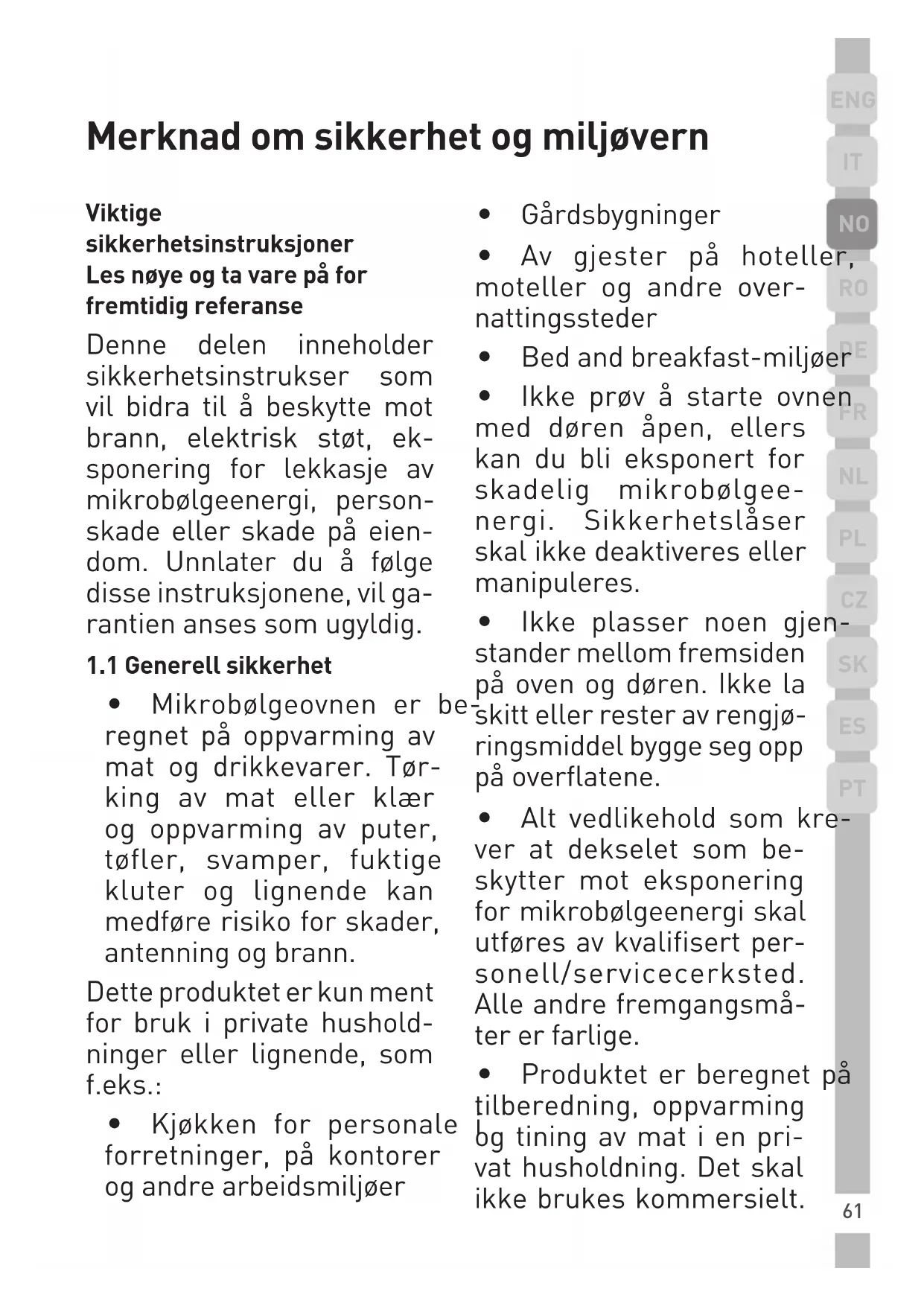 - Produktet er beregnet på tilberedning, oppvarming og tining av mat i en pri- vat husholdning. Det skal ikke brukes kommersielt.62 Merknad om sikkerhet og miljøvern Produsenten skal ikke holdes asnvarlig for ska- der som oppstår som følge av feilbruk.