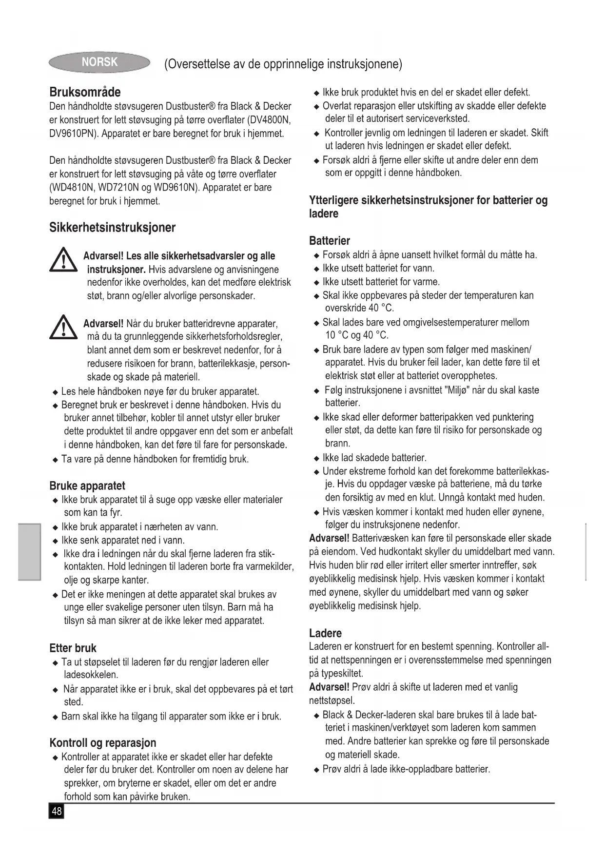 Installasjon Veggmontering (gur C) (bare DV9610PN) Produktet kan festes til veggen, der det kan oppbevares og lades på en praktisk måte. Ved montering på vegg må du sørge for at festemetoden pas- ser til veggtypen og at festet kan bære vekten av apparatet. u Merk plasseringen av skruehullene (innefor rekkevidde av en stikkontakt for ladning av støvsugeren mens den henger på veggbraketten). u Plasser laderledningen inn i det buede sporet i vegg- monteringsbraketten så det blir 8–9 tommer til overs. u Heng apparatet på veggen ved å plassere åpningen i støvsugerens sokkel over krokene på veggmonterings- braketten.50 (Oversettelse av de opprinnelige instruksjonene) NORSK Montering Tilbehør (gur B) Disse modellene kan leveres med noe eller alt av følgende tilbehør: u Et nalverktøy (12) til bruk på våte harde overater (bare WD4810N, WD7210N og WD9610N). u Et drevet børstehode (13) for støvsuging av lodne tepper. Børstehodet er særlig effektivt til å plukke opp hår, tråder osv. (bare DV9610PN). Montering (gur D) u Sett på det aktuelle tilbehøret fremst på apparatet. Pass på at tilbehøret er skjøvet helt inn. Bruk u Før første gangs bruk skal batteriet lades i minst 24 timer. u Sett apparatet i ladesokkelen når det ikke er i bruk (bare WD4810N, WD7210N og WD9610N). Advarsel! Før ladning må du passe på å tømme ut all væske og tørke godt for å unngå skade på apparatet. Ladning av batteriet (gur E og F) u Forsikre deg om at apparatet er slått av. Batteriet vil ikke bli ladet hvis på/av-bryteren er i på-stillingen. u Sett jakkpluggen til laderen (6) inn i ladesokkelen (4) til apparatet (gur E) (bare DV4800N og DV9610PN). u Sett apparatet i ladesokkelen (7) (gur F) (bare WD4810N, WD7210N og WD9610N) u Sett laderen i stikkontakten. Det må være nettstrøm i stik- kontakten. Ladningsindikatoren (3) lyser. u La apparatet lade i minst 16 timer. Under ladningen kan laderen bli varm. Dette er normalt og betyr ikke at noe er feil. Apparatet kan være tilkoblet laderen uten tidsbegrensning. Ladningsindikatoren (3) lyser så lenge apparatet er koblet til laderen som er satt i stikkontakten. Advarsel! Ikke lad batteriet hvis temperaturen i omgivelsene er under 4 °C eller over 40 °C. Slå på og av (gur G) u Når du skal slå apparatet på, skyver du på/av-bryteren (1) fremover til posisjon 1. u Når du skal slå apparatet av, skyver du på/av-bryteren (1) bakover til posisjon 0. Tørr støvsuging (DV4800N, DV9610PN) u For vanlig tørt avfall. Våt og tørr suging (bare WD4810N, WD7210N og WD9610N) u Til vanlig tørt avfall bruker du apparatet uten naltilbehøret. Advarsel! Produktet er utformet bare for lett avfall. u Dette apparatet kan også brukes til å suge opp vanlig søl av væsker. Bruk naltilbehøret på ikke-sugende, harde overater. På sugende ater, for eksempel tepper, vil ap- paratet suge opp vått søl bedre uten tilbehøret. u Du vår best resultat ved oppsuging av væske på harde overater ved å sette nalverktøyet inn i munnstykket til beholderen. u Du får best resultat ved bruk av dette tilbehøret hvis du holder apparatet i en vinkel på 45° og trekker det lang- somt mot deg. u Ikke fyll beholderen over enden av inntakskanalen. Hvis det er væske i beholderen, må du ikke snu enheten opp- ned eller sidelengs, rette munnstykket oppover eller riste støvsugeren kraftig. u Når du har suget opp væske, må du rengjøre apparatet og lteret straks. Det kan bli dannet mugg og jordslag hvis enheten ikke blir rengjort godt etter oppsuging av væske. u Før ladning må du passe på å tømme ut all væske og tørke godt for å unngå skade på apparatet. Oppnå best mulig sugekraft For å opprettholde best mulig sugekraft må du rengjøre ltrene regelmessig under bruk. Tømme og rengjøre produktet Ta av støvbeholderen og ltrene (gur H, I, J og K) Advarsel! Filtrene kan brukes på nytt og bør rengjøres jevnlig. u Trykk på utløseren (2) og trekk støvbeholderen (5) rett av. u Mens du holder støvbeholderen over en søppelbøtte eller lignende, trekker du ut lteret for å tømme ut innholdet i beholderen. u Du setter støvbeholderen på plass igjen ved å sette den tilbake på håndtaket til den klikker på plass og sitter godt. Advarsel! Bruk aldri apparatet uten ltrene. Optimal støvsug- ing kan bare oppnås med rene ltre. Skuminnsats (gur J) (WD4810N, WD7210N og WD9610N) u Sett skuminnsatsen (10) midt i vått/tørt-deektoren (11). Advarsel! Ikke bruk apparatet til å suge opp væske uten at vanndeektoren og skuminnsatsen er satt på. Forlter (gur K) (DV9610PN) Filteret og forlteret kan skilles så de kan rengjøres bedre. u Vri forlteret (9) med klokken, og løft det av lteret (8). Rengjøring av støvbeholdere og ltre u Støvbeholderne og ltrene kan vaskes i varmt såpevann. u Sørg for at ltrene og støvbeholderen er tørre før du setter dem på plass igjen.51 (Oversettelse av de opprinnelige instruksjonene) NORSK Utskifting av ltrene Filtrene bør skiftes ut hver 6.–9. måned og ellers hvis de er slitte eller skadet. Reserveltre får du hos din Black & Decker-forhandler: For modell DV4800N bruker du lter med delenummer VF110-XJ For modell DV9610PN bruker du lter med delenummer VF110P-XJ For modellene WD4810N, WD7210N og WD9610N bruker du lter med delenummer WVF110-XJ Vedlikehold Det nettdrevne/batteridrevne Black & Decker-apparatet/ verktøyet er konstruert for å være i drift over lengre tid med et minimum av vedlikehold. Det er avhengig av riktig stell og regelmessig rengjøring for å fungere som det skal til enhver tid. Advarsel! Før du utfører vedlikehold på nettdrevet/batterid- revet elektroverktøy: u Slå av apparatet/verktøyet og trekk ut støpselet. u Eller slå av apparatet/verktøyet og fjern batteriet fra dette hvis apparatet/verktøyet har separat batteripakke. u Eller la batteriet gå helt tomt hvis det er innebygd, og slå deretter av. u Fjern laderen fra stikkontakten før du rengjør den. Laderen krever ikke 