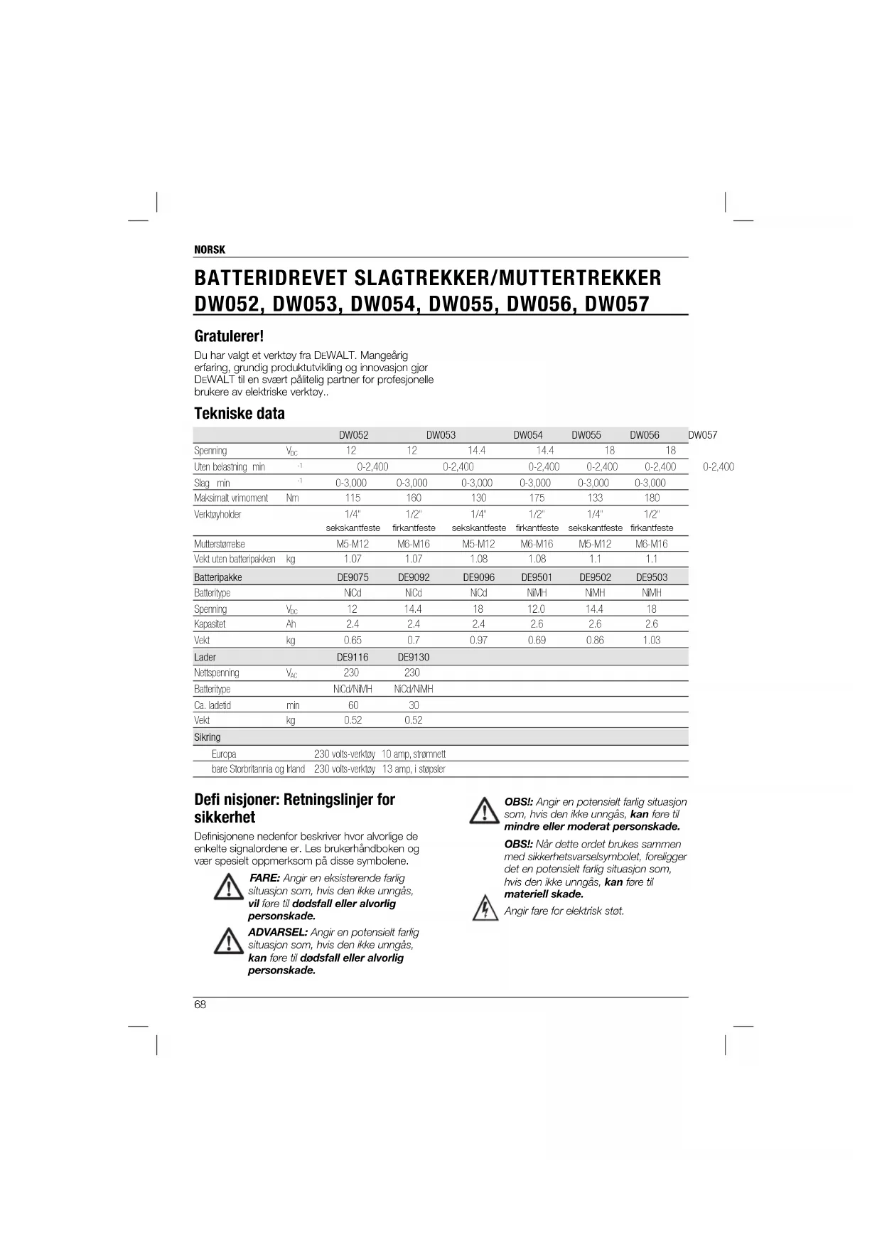 - Ta deg tid til å lese og gjøre deg godt kjent med brukerhåndboken før du tar verktøyet i bruk. Beskrivelse (fi g. 1) ADVARSEL: Verktøyet eller delene skal aldri modifiseres, ellers kan det oppstå materiell skade eller personskade. TILTENKT BRUK DW052, DW053, DW054, DW055, DW056 og DW057 batteridrevne slagtrekkere/muttertrekkere er beregnet brukt ved fagmessige slagskrueoppgaver. Slagfunksjonen gjør dette verktøyet spesielt nyttig når festeanordninger skal festes i tre, metall eller betong. SKAL IKKE brukes ved høy luftfuktighet eller nær antennelige væsker eller gasser. De batteridrevne slagtrekkerne/muttertrekkerne er elektroverktøy som er beregnet på fagfolk. LA IKKE barn røre verktøyet. Barn under 16 år skal være under tilsyn. a. Bryter med variable hastighet b. Forover/bakover-skyvebryter c. Verktøyholder d. Pistolhåndtak e. Batteripakke f. Utløserknapper g. Lader h. Ladeindikator (rød) Lader DE9130 kan brukes med DEWALT NiCd- batteripakker på 7,2 til 14,4 V. DE9116 kan rukes med D EWALT NiCd/NiMH-batteripakker på 7,2 til