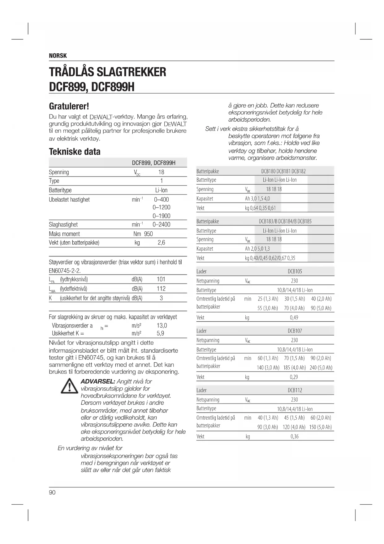 Batteritype 10,8/14,4/18 Li-Ion Omtrentlig ladetid på batteripakker min 40 (1,3 Ah) 45 (1,5 Ah) 60 (2,0 Ah) 90 (3,0 Ah) 120 (4,0 Ah) 150 (5,0 Ah) Vekt kg 0,36 Gratulerer! Du har valgt et DeWALT -verktøy. Mange års erfaring, grundig produktutvikling og innovasjon gjør DeWALT
