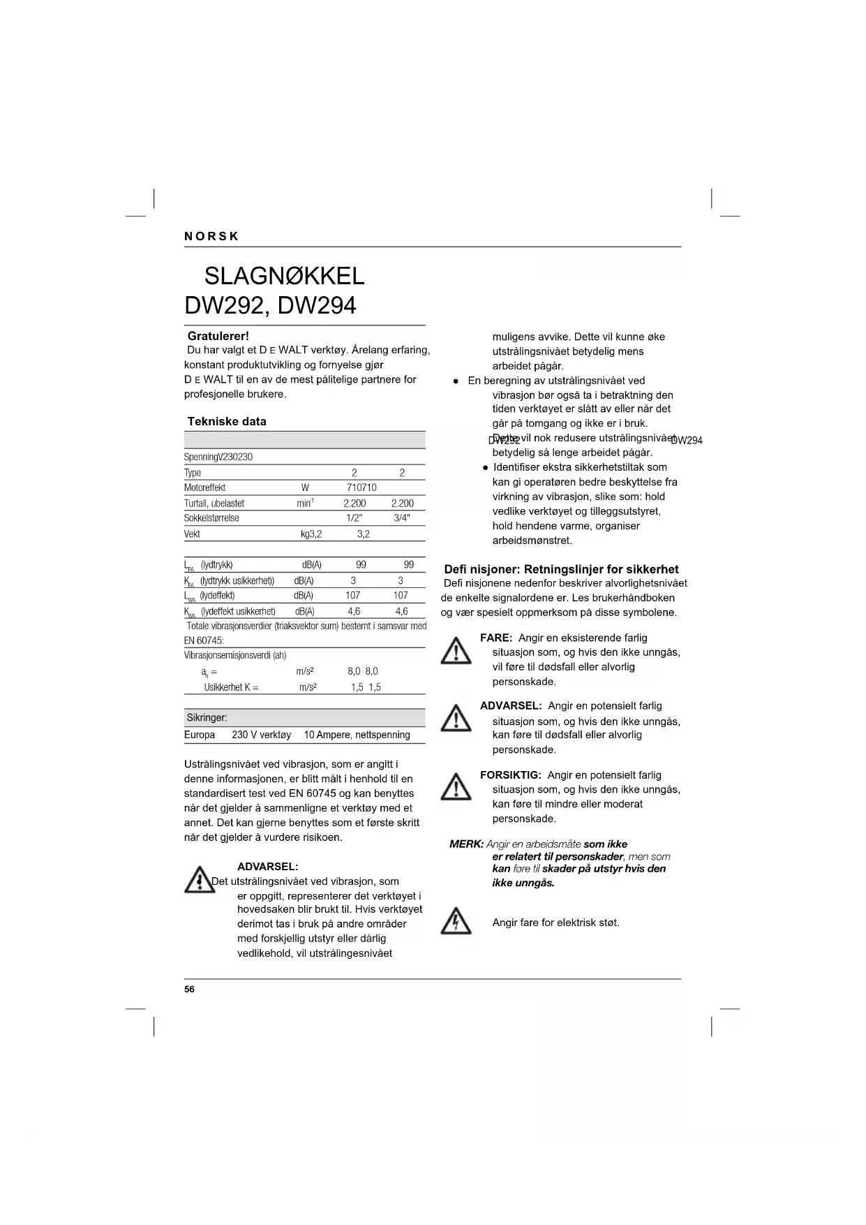 MERK: Angir en arbeidsmåte som ikke er relatert til personskader, men som kan føre til skader på utstyr hvis den ikke unngås. Angir fare for elektrisk støt. SLAGNØKKEL DW292, DW294 Gratulerer! Du har valgt et D E WALT verktøy. Årelang erfaring, konstant produktutvikling og fornyelse gjør D E WALT til en av de mest pålitelige partnere for profesjonelle brukere. Tekniske data DW292 DW294 Spenning V 230 230 Type 2 2 Motoreffekt W 710 710 Turtall, ubelastet min