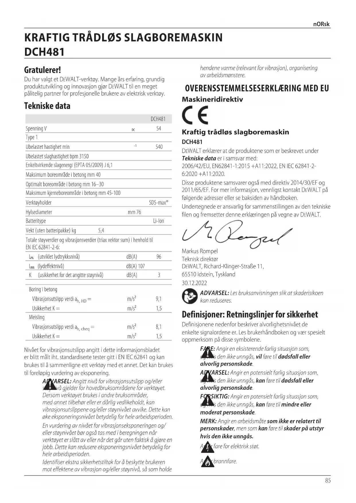 Angirbrannfare. Gratulerer! Du har valgt et DeWALT-verktøy. Mange års erfaring, grundig produktutvikling og innovasjon gjør DeWALT til en meget pålitelig partner for profesjonelle brukere av elektriskverktøy. Tekniske data DCH481 Spenning V