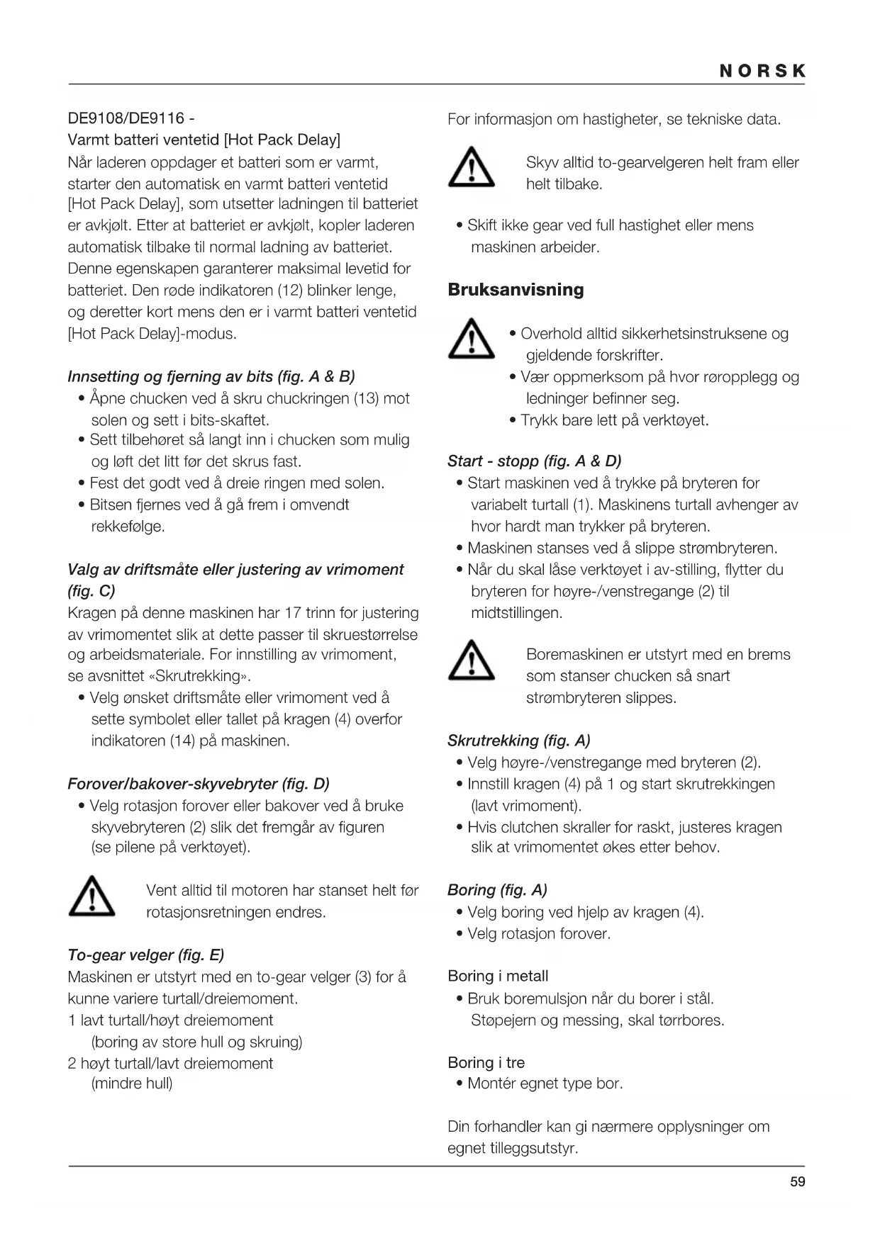 - Ta deg tid til å lese nøye igjennom instruksjonsboken slik at du forstår innholdet før verktøyet tas i bruk.58 NORSK Beskrivelse (fig. A) Din oppladbare oppladbar boremaskin/skrutrekker DW927/DW928/DW929/DW956/DW957 er utformet for profesjonell boring og skrutrekking. 1 Bryter for variabelt turtall 2 Forover/bakover-skyvebryter 3 To-gear velger 4 Slagvelger/justeringskrage for dreiemoment 5 Krave-stillinger 6 Selvspennende chuck 7 Bitsholder 8 Håndtak 9 Batteripakke Lader Din lader DE9107 kan bruke DEWALT NiCd-batteripakker som gir mellom 7,2 til 14,4 V. Din lader DE9108/DE9118 kan bruke DEWALT NiCd-batteripakker som gir mellom 7,2 til 18 V. Din lader DE9116 kan bruke DEWALT NiCd- og NiMH-batteripakker som gir mellom 7,2 til 18 V. 9 Batteripakke 10 Sperrer 11 Lader 12 Ladelampe (rød) Elektrisk sikkerhet Laderen er kun konstruert for én spenning. Kontroller alltid at nettspenningen er i samsvar med spenningen på typeskiltet. Laderen er dobbeltisolert i samsvar med EN 60335. Jordet ledning er derfor ikke nødvendig. Skifting av kabel eller støpsel Tenk på sikkerhetsforskriftene ved skifting av kabel eller støpsel. Et støpsel med blottede kopperledere er farlig hvis det koples til en strømførende kontakt. Montering og justering
