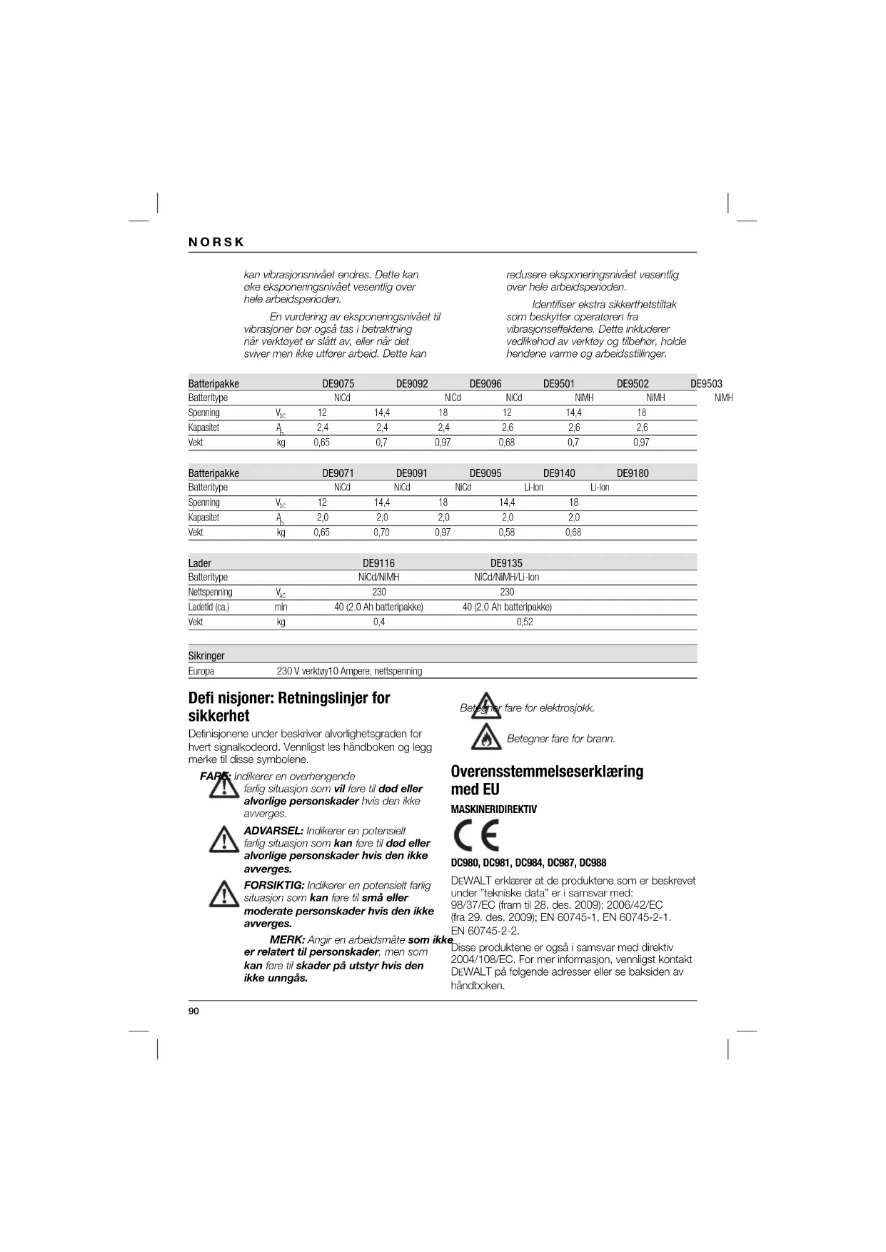 = m/s² <2,5 <2,5 <2,5 <2,5 <2,5 Usikkerhet K : m/s² 1,5 1,5 1,5 1,5 1,5 Vibrasjonsverdien som oppgis i denne manualen har blitt målt i samsvar med en standard test utført i henhold til EN 60745, og kan brukes til å sammenligne ett verkøy med et annet. Den kan brukes til et midlertertidig overslag av eksponering. ADVARSEL: Det erklærte vibrasjonsnivået reflekterer verktøyets hovedbruksområder. Dersom verktøyet brukes til andre formål, med annet tilbehør, eller ikke har blitt vedlikeholdt, så90 kan vibrasjonsnivået endres. Dette kan øke eksponeringsnivået vesentlig over hele arbeidsperioden. En vurdering av eksponeringsnivået til vibrasjoner bør også tas i betraktning når verktøyet er slått av, eller når det sviver men ikke utfører arbeid. Dette kan Betegner fare for elektrosjokk. Betegner fare for brann. Overensstemmelseserklæring med EU MASKINERIDIREKTIV DC980, DC981, DC984, DC987, DC988 DEWALT erklærer at de produktene som er beskrevet under ”tekniske data” er i samsvar med: 98/37/EC (fram til 28. des. 2009); 2006/42/EC (fra 29. des. 2009); EN 60745-1, EN 60745-2-1. EN 60745-2-2. Disse produktene er også i samsvar med direktiv 2004/108/EC. For mer informasjon, vennligst kontakt DEWALT på følgende adresser eller se baksiden av håndboken. Defi nisjoner: Retningslinjer for sikkerhet Definisjonene under beskriver alvorlighetsgraden for hvert signalkodeord. Vennligst les håndboken og legg merke til disse symbolene. FARE: Indikerer en overhengende farlig situasjon som vil føre til død eller alvorlige personskader hvis den ikke avverges. ADVARSEL: Indikerer en potensielt farlig situasjon som kan føre til død eller alvorlige personskader hvis den ikke avverges. FORSIKTIG: Indikerer en potensielt farlig situasjon som kan føre til små eller moderate personskader hvis den ikke avverges. MERK: Angir en arbeidsmåte som ikke er relatert til personskader, men som kan føre til skader på utstyr hvis den ikke unngås. NORSK redusere eksponeringsnivået vesentlig over hele arbeidsperioden. Identifiser ekstra sikkerthetstiltak som beskytter operatøren fra vibrasjonseffektene. Dette inkluderer vedlikehod av verktøy og tilbehør, holde hendene varme og arbeidsstillinger. Batteripakke DE9075 DE9092 DE9096 DE9501 DE9502 DE9503 Batteritype NiCd NiCd NiCd NiMH NiMH NiMH Spenning V