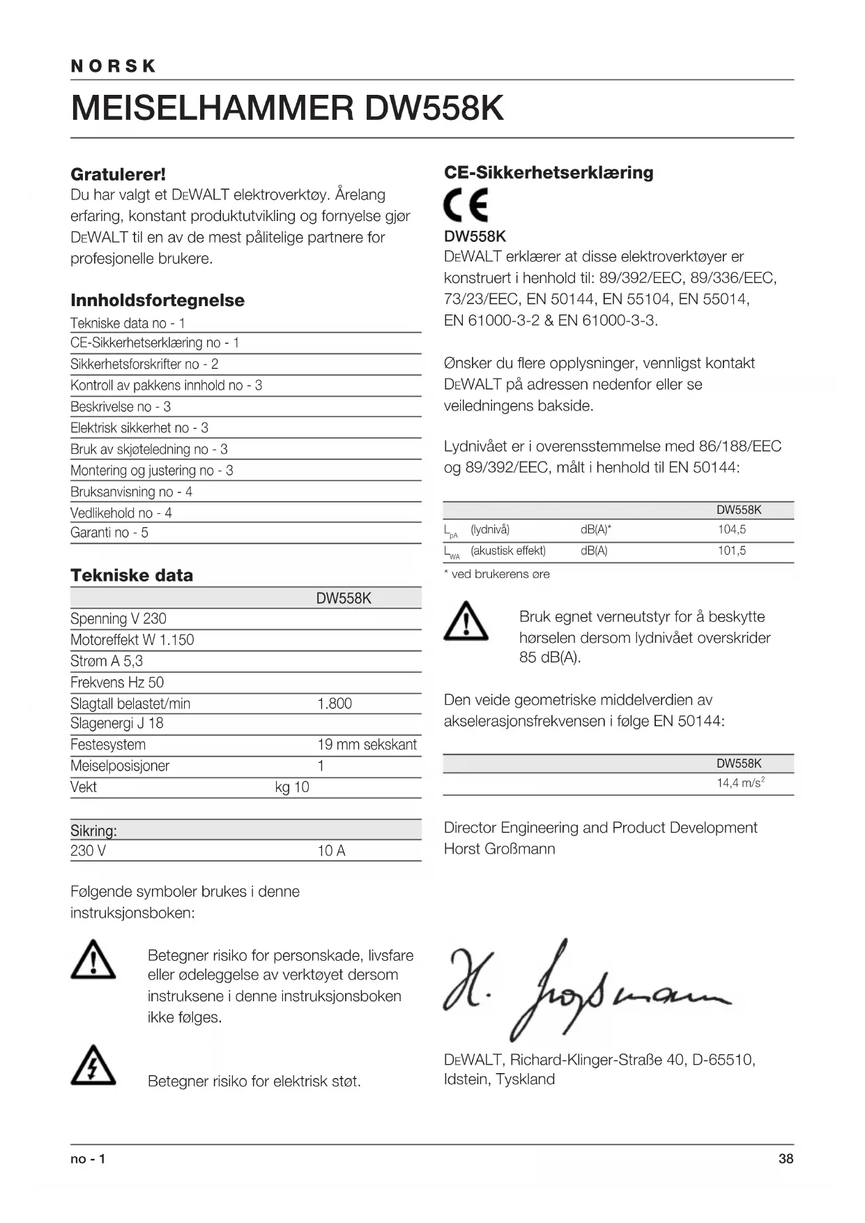 Director Engineering and Product Development Horst Großmann DEWALT, Richard-Klinger-Straße 40, D-65510, Idstein, Tyskland39 no - 2 NORSK Sikkerhetsforskrifter Ta deg tid til å lese nøye gjennom bruksanvisningen før du begynner å bruke maskinen. Oppbevar bruksanvisningen på et lett tilgjengelig sted slik at alle som skal bruke maskinen lett kan finne den. I tillegg til nedenforstående forskrifter, må alle vernebestemmelsene til Statens Arbeidstilsyn følges når det gjelder arbeid med elektroverktøy. ADVARSEL! Ved bruk av elektroverktøy må disse grunnleggende sikkerhetsforskrifter følges for å redusere risikoen for elektrisk støt, personskade og brann. 1 Bruk hørselsvern Støynivået ved bearbeiding av forskjellige materialer kan variere, og i blant kan nivået overstige 85 dB(A). For å beskytte deg selv bør du alltid bruke hørselsvern. 2 Hold arbeidsområdet rent og ryddig En uryddig arbeidsplass innbyr til skader. 3 Tenk på arbeidsmiljøet Utsett ikke elektroverktøy for regn. Ikke bruk det på fuktige eller våte steder. Sørg for god belysning over arbeidsplassen. Bruk ikke elektroverktøy i nærheten av brannfarlige væsker eller gasser. 4 Beskytt deg mot elektrisk støt Unngå kroppskontakt med jordede deler (for eksempel vannrør, komfyrer, kjøleskap o.l.). Under ekstreme arbeidsforhold (for eksempel ved høy luftfuktighet, forekomst av metallstøv o.l.) kan man øke sikkerheten ved å tilkoble en jordfeilbryter. 5 Hold barn unna Ikke la barn komme i kontakt med verktøyet eller skjøteledningen. Det skal holdes tilsyn med barn under 16 år. 6 Oppbevar elektroverktøy på et trygt sted Når maskinen ikke er i bruk, skal den oppbevares på et tørt sted, gjerne høyt oppe og innlåst, utenfor barns rekkevidde. 7 Overbelast ikke maskinen Maskinen arbeider bedre og sikrere innenfor det angitte effektområdet. 8 Bruk riktig elektroverktøy Tving ikke en maskin til å gjøre arbeid som krever kraftigere verktøy. Bruk ikke elektroverktøy til formål det ikke er ment for, som for eksempel å fjerne kvister eller kappe ved med en håndsirkelsag. 9 Kle deg riktig Ha ikke på deg løstsittende klær eller smykker. De kan sette seg fast i de bevegelige delene. Vi anbefaler gummihansker og sko som ikke glir når du arbeider utendørs. Bruk hårnett hvis du har langt hår. 10 Bruk vernebriller Bruk vernebriller for å unngå at det blåser støv inn i øynene og skader deg. Hvis det støver mye, bør du bruke ansikts- eller støvmaske. 11 Stell pent med ledningen Bær ikke maskinen i ledningen og, trekk ikke i ledningen når du skal ta støpselet ut av stikkontakten. Utsett ikke ledningen for varme, olje eller skarpe kanter. 12 Sikre arbeidsstykket Bruk tvinger eller skrustikker til å feste arbeidsstykket med. Dette er sikrere enn å bruke hånden, og du får begge hendene fri til å arbeide med. 13 Strekk deg ikke for langt Pass på at du alltid har sikkert fotfeste og balanse. 14 Vær nøye med vedlikeholdet Hold tilbehøret skarpt og rent. Følg forskriftene når det gjelder vedlikehold og skifte av tilbehør. Kontroller maskinens ledning regelmessig og få den reparert av et autorisert verksted om den skulle bli skadet. Kontroller skjøteledninger regelmessig, skift dem ut om de skulle bli skadet. Hold håndtakene tørre, rene og fri for olje og fett. 15 Trekk støpselet ut av stikkontakten Trekk alltid støpselet ut av stikkontakten når maskinen ikke er i bruk, ved vedlikehold og ved skifte av tilbehør. 16 Fjern nøkler Gjør det til vane å sjekke om nøkler og justeringsverktøy er fjernet før maskinen startes. 17 Unngå at verktøyet blir slått på utilsiktet Bær ikke maskinen med fingeren på strømbryteren når den er tilkoblet strømnettet. Pass på at strømbryteren er avslått når du setter støpselet i stikkontakten. 18 Utendørs skjøteledning Utendørs må det bare brukes skjøteledning som er tillatt for utendørs bruk og merket for dette. 19 Vær oppmerksom Se på det du gjør. Bruk sunn fornuft. Bruk ikke maskinen når du er trett.40 NORSK no - 3 20 Sjekk skadede deler før du setter støpselet i stikkontakten Før fortsatt bruk av maskinen skal eventuelle skadede deler eller deksler kontrolleres nøye for å bringe på det rene om de fungerer riktig og utfører det de skal. Kontroller justeringen av bevegelige deler, om de sitter i klemme, om deler er brukket. Sjekk at alt er riktig montert og er slik det skal være. En del eller et deksel som er skadet, skal repareres eller skiftes ut av et autorisert verksted dersom ikke annet er angitt i bruksanvisningen. Ødelagte brytere skal repareres av et autorisert serviceverksted. Bruk ikke maskinen hvis den ikke kan slås av og på med bryteren. 21 ADVARSEL! Bruk bare tilbehør og utstyr som anbefales i bruksanvisningen og i katalogene. Bruk av annet verktøy eller tilbehør enn det som anbefales i bruksanvisningen eller i katalogene kan medføre en mulig risiko for personskade. 22 La verktøyet repareres av et autorisert DEWALT serviceverksted Dette elektroverktøyet er i samsvar med gjeldende sikkerhetsforskrifter. Unngå risiko: Overlat alltid reparasjon av elektriske apparater til kvalifisert servicepersonale. Kontroll av pakkens innhold Pakken inneholder: 1 Meiselhammer 1 Sidehåndtak 1 Unbrakonøkkel 1 Spiss meisel 1 Støvlokk 1 Koffert 1 Instruksjonsbok 1 Splitt-tegning