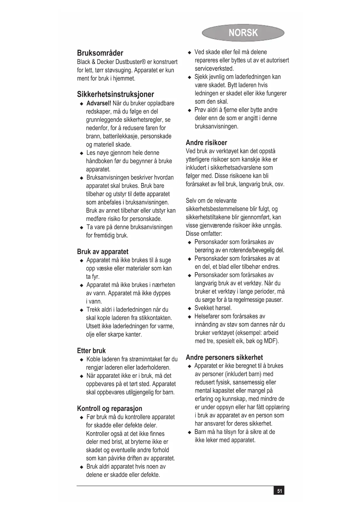 Black & Decker-batterier kan lades mange ganger. Beskytt miljøet ved å levere kasserte batterier til kildesortering. Beskytt miljøet ved å avhende brukte batterier i samsvar med lokale bestemmelser. u Lad ut batteriet ved å kjøre apparatet helt til motoren stopper. Batteriet sitter under bakre ende av apparatet. u Fjern radiatormunnstykket fra tilbehørsholderen. u Press skyvelåsen (12) frem mot forsiden av apparatet. u Fjern tilbehørsholderen.u Bank produktet forsiktig mot en fast og stabil overate, som vist i g. H, slik at batteriet fjernes. u Legg batteriet i egnet innpakning for å sikre at kontaktene ikke kan kortsluttes. u Ta med batteriet til forhandleren eller den lokale resirkuleringsstasjonen. Advarsel! Når batteriet først er fjernet, kan det ikke settes på igjen. Tekniske data V1250 H2 V1250N H2 Spenning V 12 12 Vekt kg 1,8 1,7 V4800 H2 V4810 H2 Spenning V 4,8 4,8 Vekt kg 1,2 1,2 V4820 H2 V7210 H2 Spenning V 4,8 7,2 Vekt kg 1,2 1,455 NORSK V9650 H2 Spenning V 9,6 Vekt kg 1,6 Lader 5102404-08 VA090020D Modell V48 V72 Spenning V