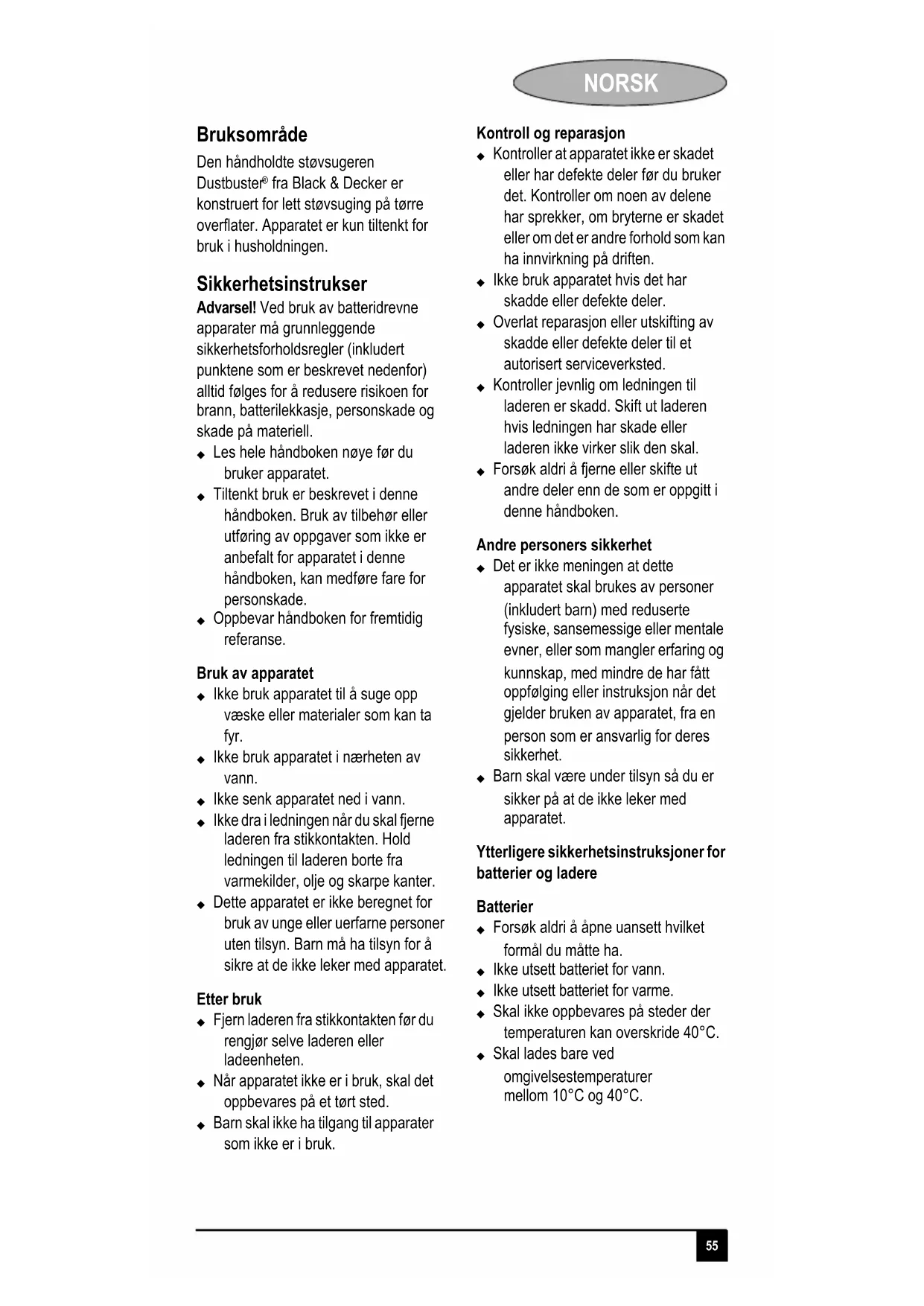 fra Black & Decker er konstruert for lett støvsuging på tørre overflater. Apparatet er kun tiltenkt for bruk i husholdningen. Sikkerhetsinstrukser Advarsel! Ved bruk av batteridrevne apparater må grunnleggende sikkerhetsforholdsregler (inkludert punktene som er beskrevet nedenfor) alltid følges for å redusere risikoen for brann, batterilekkasje, personskade og skade på materiell. Les hele håndboken nøye før du bruker apparatet. Tiltenkt bruk er beskrevet i denne håndboken. Bruk av tilbehør eller utføring av oppgaver som ikke er anbefalt for apparatet i denne håndboken, kan medføre fare for personskade. Oppbevar håndboken for fremtidig referanse. Bruk av apparatet Ikke bruk apparatet til å suge opp væske eller materialer som kan ta fyr. Ikke bruk apparatet i nærheten av vann. Ikke senk apparatet ned i vann. Ikke dra i ledningen når du skal fjerne laderen fra stikkontakten. Hold ledningen til laderen borte fra varmekilder, olje og skarpe kanter. Dette apparatet er ikke beregnet for bruk av unge eller uerfarne personer uten tilsyn. Barn må ha tilsyn for å sikre at de ikke leker med apparatet. Etter bruk Fjern laderen fra stikkontakten før du rengjør selve laderen eller ladeenheten. Når apparatet ikke er i bruk, skal det oppbevares på et tørt sted. Barn skal ikke ha tilgang til apparater som ikke er i bruk. Kontroll og reparasjon Kontroller at apparatet ikke er skadet eller har defekte deler før du bruker det. Kontroller om noen av delene har sprekker, om bryterne er skadet eller om det er andre forhold som kan ha innvirkning på driften. Ikke bruk apparatet hvis det har skadde eller defekte deler. Overlat reparasjon eller utskifting av skadde eller defekte deler til et autorisert serviceverksted. Kontroller jevnlig om ledningen til laderen er skadd. Skift ut laderen hvis ledningen har skade eller laderen ikke virker slik den skal. Forsøk aldri å fjerne eller skifte ut andre deler enn de som er oppgitt i denne håndboken. Andre personers sikkerhet Det er ikke meningen at dette apparatet skal brukes av personer (inkludert barn) med reduserte fysiske, sansemessige eller mentale evner, eller som mangler erfaring og kunnskap, med mindre de har fått oppfølging eller instruksjon når det gjelder bruken av apparatet, fra en person som er ansvarlig for deres sikkerhet. Barn skal være under tilsyn så du er sikker på at de ikke leker med apparatet. Ytterligere sikkerhetsinstruksjoner for batterier og ladere Batterier Forsøk aldri å åpne uansett hvilket formål du måtte ha. Ikke utsett batteriet for vann. Ikke utsett batteriet for varme. Skal ikke oppbevares på steder der temperaturen kan overskride 40°C. Skal lades bare ved omgivelsestemperaturer mellom 10°C og 40°C.56 NORSK Bruk bare ladere av typen som følger med maskinen/redskapet. Hvis du bruker feil lader, kan dette føre til et elektrisk støt eller at batteriet overopphetes. Følg instruksjonene i avsnittet ”Miljø” når du skal kaste batterier. Ikke skad eller deformer batteripakken ved punktering eller støt, da dette kan føre til risiko for personskade og brann. Ikke lad skadede batterier. Under ekstreme forhold kan det forekomme batterilekkasje. Hvis du oppdager væske på batteriene, må du tørke den forsiktig av med en klut. Unngå kontakt med huden. Hvis væsken kommer i kontakt med huden eller øynene, følger du instruksjonene nedenfor. Advarsel! Batterivæsken kan føre til personskade eller skade på eiendom. Ved hudkontakt skyller du umiddelbart med vann. Hvis huden blir rød eller irritert eller smerter inntreffer, søk øyeblikkelig medisinsk hjelp. Hvis væsken kommer i kontakt med øynene, skyller du umiddelbart med rent vann og søker øyeblikkelig medisinsk hjelp. Ladere Laderen er konstruert for en bestemt spenning. Kontroller alltid at nettspenningen er i overensstemmelse med spenningen på typeskiltet. Advarsel! Prøv aldri å skifte ut laderen med et vanlig nettstøpsel. Black & Decker-laderen skal bare brukes til å lade batteriet i apparatet/ verktøyet som laderen kom sammen med. Andre batterier kan sprekke og føre til personskade og materiell skade. Prøv aldri å lade ikke-oppladbare batterier. Hvis strømledningen blir skadet, må den skiftes av produsenten eller et autorisert Black & Decker- servicesenter for å unngå fare. Ikke utsett laderen for vann. Ikke åpne laderen. Ikke stikk gjenstander eller fingre ned i laderen. Apparatet/verktøyet/batteriet må plasseres på et sted med god gjennomlufting når det lades. Elektrisk sikkerhet Laderen er konstruert for en bestemt spenning. Kontroller alltid at nettspenningen er i overensstemmelse med spenningen på typeskiltet. Prøv aldri å skifte ut laderen med en vanlig nettplugg. Symboler på laderen Les hele håndboken grundig. Laderen er dobbeltisolert. Derfor trengs ingen jording. Feilsikker skilletransformator. Nettstrømtilførselen er elektrisk skilt fra transformatorutgangen. Laderen slår seg av automatisk hvis temperaturen i omgivelsene blir for høy. Som følge av dette vil ikke laderen virke. Ladeenheten må kobles fra strømforsyningen og repareres på et autorisert serviceverksted. Ladeenheten er bare tiltenkt for bruk innendørs.