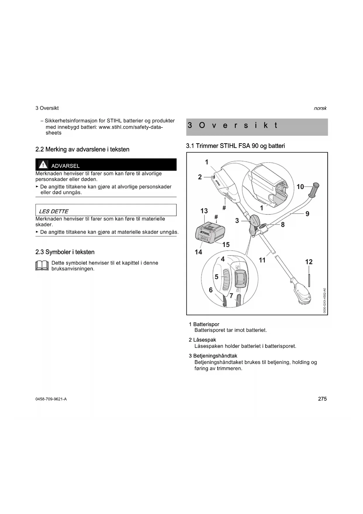 norsk 3 Oversikt– Sikkerhetsinformasjon for STIHL batterier og produkter med innebygd batteri: www.stihl.com/safety-data-sheets