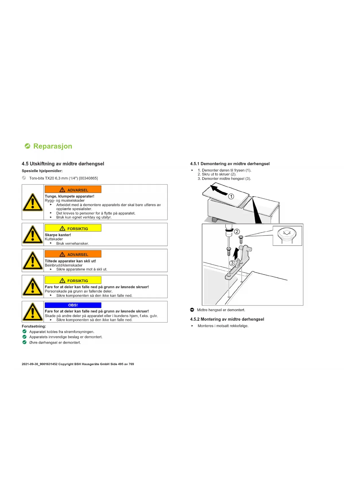 Monteres i motsatt rekkefølge. Reparasjon 2021-09-30_9001631452 Copyright BSH Hausgeräte GmbH Side492av7694.4 Utskiftning av øvre dørhengsel (dør med display) Spesielle hjelpemidler: Torx-bits TX20 6,3mm (1/4") [00340865] ADVARSEL Tunge, klumpete apparater! Rygg- og muskelskader