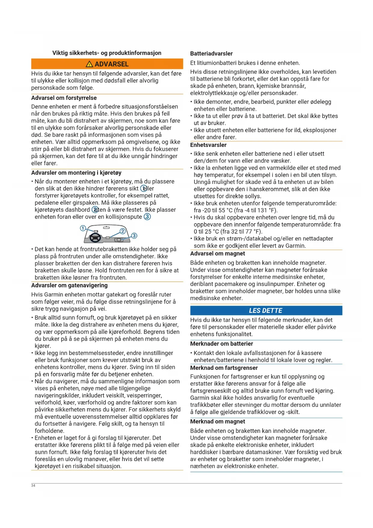 - Ikke bruk en strøm-/datakabel og/eller en nettadapter som ikke er godkjent eller levert av Garmin. Advarsel om magnet Både enheten og braketten kan inneholde magneter. Under visse omstendigheter kan magneter forårsake forstyrrelser for enkelte interne medisinske enheter, deriblant pacemakere og insulinpumper. Enheter og braketter som inneholder magneter, bør holdes unna slike medisinske enheter. LES DETTE Hvis du ikke tar hensyn til følgende merknader, kan det føre til personskader eller materielle skader eller påvirke enhetens funksjonalitet. Merknader om batterier
