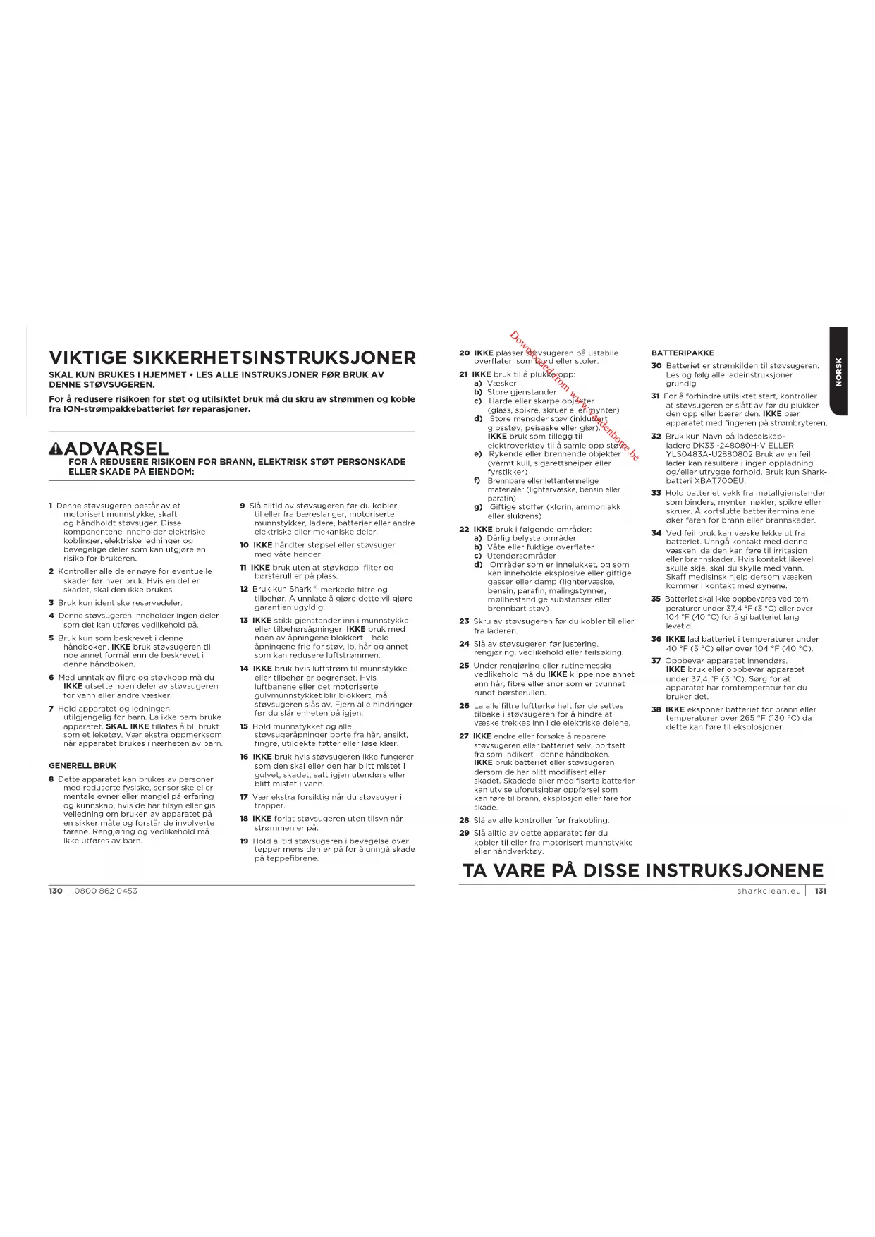 Ladekabel Fig. A Fig. CFig. B Fig. DMERK: Hvis støvsugeren fremdeles ikke fungerer som den skal, kan du kontakte kundeservice. NORSK 142 1430800 862 0453 sharkclean.eu Downloaded from www.vandenborre.beFEM (5) ÅRS BEGRENSET GARANTI Når du kjøper et produkt i Norge som forbruker får du visse lovmessige rettigheter når det gjelder produktets kvalitet (dine «lovfestede rettigheter»). Du kan håndheve disse lovmessige rettighetene overfor forhandleren din. Men hos Shark har vi så stor tro på kvaliteten på produktene våre (“Produktene”) at vi gir deg en ekstra produsentgaranti på opptil fem år (2 år er standard, og du får 3 år til når du registrerer deg (“Utvidet garanti”)). Denne garantien gjelder kun dersom produktet er kjøpt som nytt og ubrukt. Disse vilkårene og betingelsene gjelder kun for garantiene våre – dine lovfestede rettigheter som kjøper påvirkes ikke. Vær oppmerksom på at 5-årsgarantien er tilgjengelig i alle EU-land og i Storbritannia, dersom landet ikke lenger er et EU-land under garantiperioden. Vilkårene nedenfor beskriver forutsetningene for og omfanget av garantiene våre , som ytes av SharkNinja Germany GmbH, Kurt–Blaum–Platz 8, 63450 Hanau (Tyskland) (“oss”, “vår” eller “vi”). De påvirker ikke dine lovfestede rettigheter eller forhandlerens forpliktelser og din kontrakt med dem. Det samme gjelder hvis du har kjøpt produktet direkte fra Shark. Litium-Ion-batteriet er ikke dekket av 5-års garantien (se batterigaranti på neste side). Shark