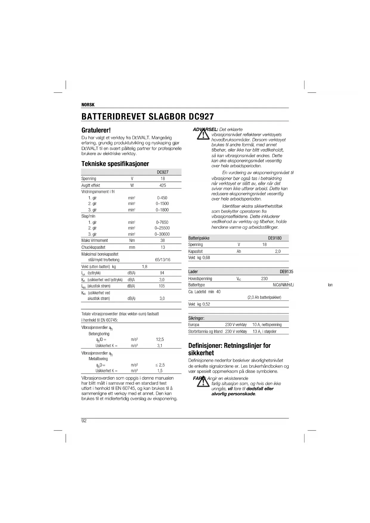 - Ta deg tid til å lese og gjøre deg godt kjent med brukerhåndboken før du tar verktøyet i bruk. Beskrivelse (fi g. 1–5) ADVARSEL: Verktøyet eller delene må aldri endres. Dette kan medføre materielle skader eller personskader. a. Bryter b. Forover/revers kontrollknapp c. Stillingsnivåkrave d. Skyvebryter for vridningsmoment e. Girveksler f. Chuckkrave g. Batteriutløsningsknapper TILTENKT BRUK Din DC927 slagboremaskin er utarbeidet med tanke på profesjonell boring, slagboring og skruing. IKKE BRUK ved høy luftfuktighet eller nær antennelige væsker eller gasser. Disse slagborene er profesjonelle elektroverktøyer. LA IKKE barn røre verktøyet. Det kreves oppsyn når uerfarne operatører bruker dette verktøyet. Sikkerhet ved bruk av elektrisitet Den elektriske motoren er kun beregnet på én bestemt spenning. Sjekk alltid at spenningen i batteripakken stemmer overens med spenningen på klassifiseringsskiltet. Sjekk også at spenningen i laderen stemmer med nettspenningen. Denne DEWALT-laderen er dobbeltisolert i samsvar med EN 60335. Det er derfor ikke påkrevd å bruke jordledning. Hvis ledningen er skadet må den skiftes ut med en spesialledning som kun er tilgjengelig gjennom DEWALTS serviceorganisasjon.NORSK