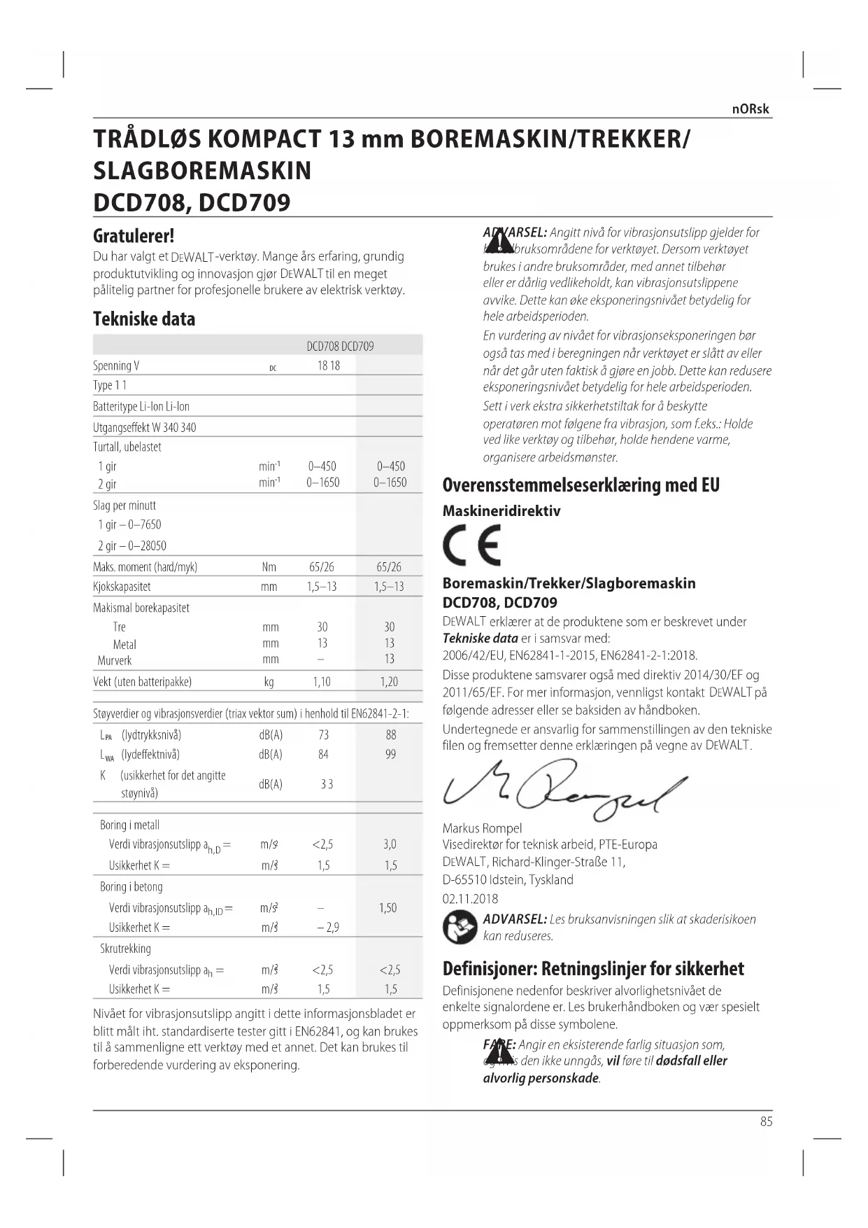 ADVARSEL: Angitt nivå for vibrasjonsutslipp gjelder for hovedbruksområdene for verktøyet. Dersom verktøyet brukes i andre bruksområder, med annet tilbehør eller er dårlig vedlikeholdt, kan vibrasjonsutslippene avvike. Dette kan øke eksponeringsnivået betydelig for helearbeidsperioden. En vurdering av nivået for vibrasjonseksponeringen bør også tas med i beregningen når verktøyet er slått av eller når det går uten faktisk å gjøre en jobb. Dette kan redusere eksponeringsnivået betydelig for helearbeidsperioden. Sett i verk ekstra sikkerhetstiltak for å beskytte operatøren mot følgene fra vibrasjon, som f.eks.: Holde ved like verktøy og tilbehør, holde hendene varme, organiserearbeidsmønster. Overensstemmelseserklæring med EU Maskineridirektiv Boremaskin/Trekker/Slagboremaskin DCD708, DCD709 DeWALT erklærer at de produktene som er beskrevet under Tekniske data er i samsvar med: 2006/42/EU, EN62841-1-2015, EN62841-2-1:2018. Disse produktene samsvarer også med direktiv 2014/30/EF og 2011/65/EF. For mer informasjon, vennligst kontakt DeWALT