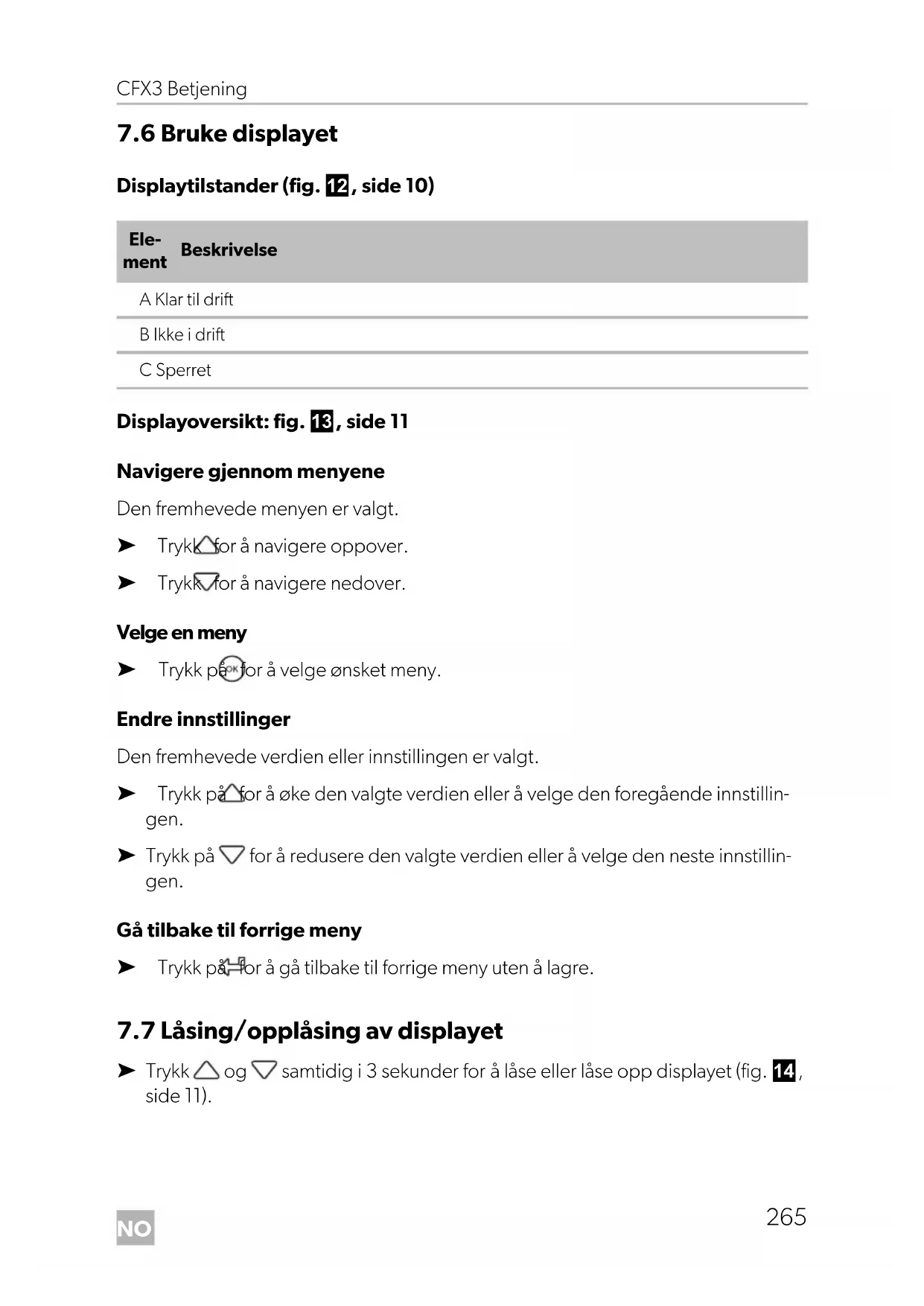 - Hvis du bruker kjøleboksen med vekselspenningsforsyning om bord på en båt, må du koble en jordfeilbryter mellom vekselspenningsfor- syningen og kjøleboksen. Be om råd fra fagfolk. PASS PÅ! Fare for overopphetning Sørg for at det alltid er tilstrekkelig ventilasjon, slik at varmen som opp- står under drift kan føres bort. Pass på at lufteåpningene ikke blokkeres. Påse at apparatet står langt nok unna vegger eller gjenstander, slik at luf- ten kan sirkulere. MERK Ved drift med batteri slås displayet av automatisk hvis batterispenningen er lav. DometicCFX3_OPM_4445103157_EMEA16_202x-xx-xx.book Seite 264 Dienstag, 27. Oktober 2020 5:42 17NO CFX3 Betjening