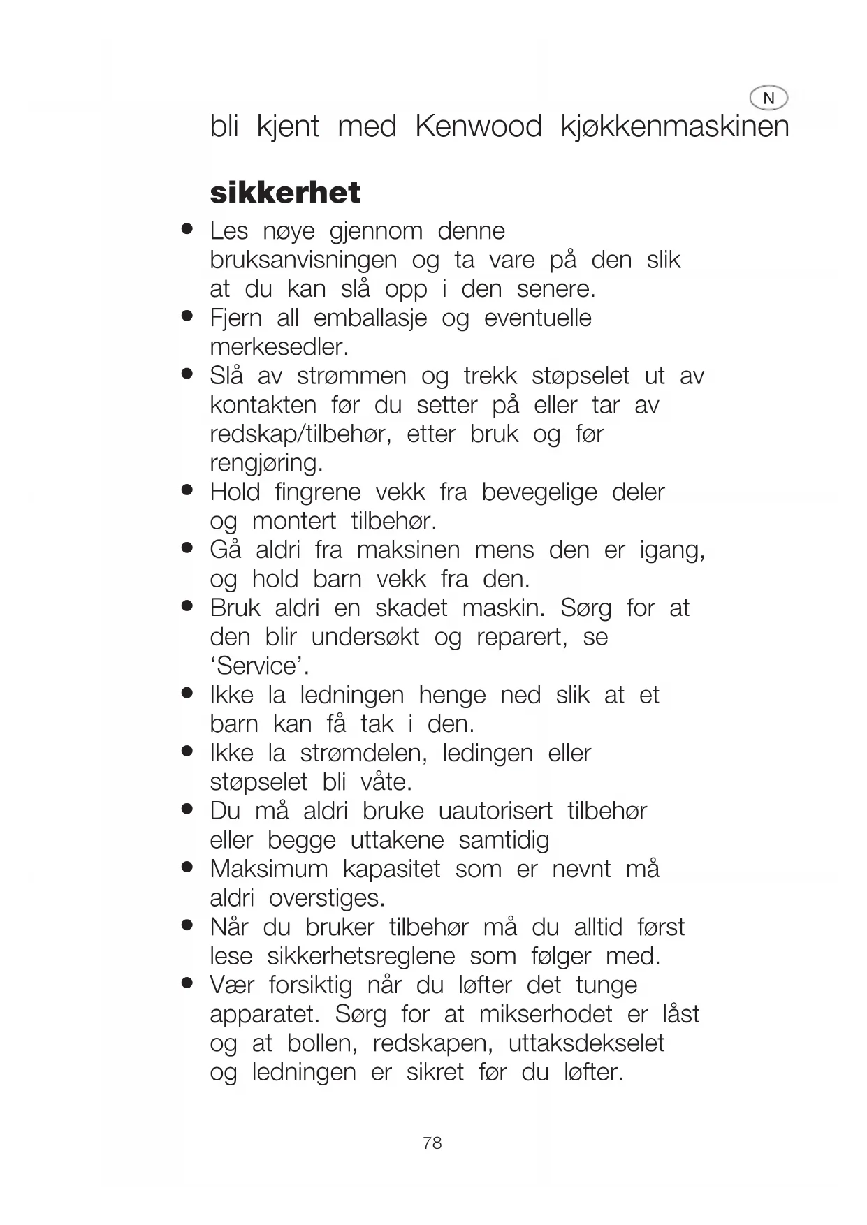 Bruk bare apparatet til dets tiltenkte hjemlige bruk. Kenwood frasier seg ethvert ansvar ved feilaktig bruk eller dersom apparatet ikke er brukt i henhold til denne bruksanvisningen. 79før du setter i støpselet