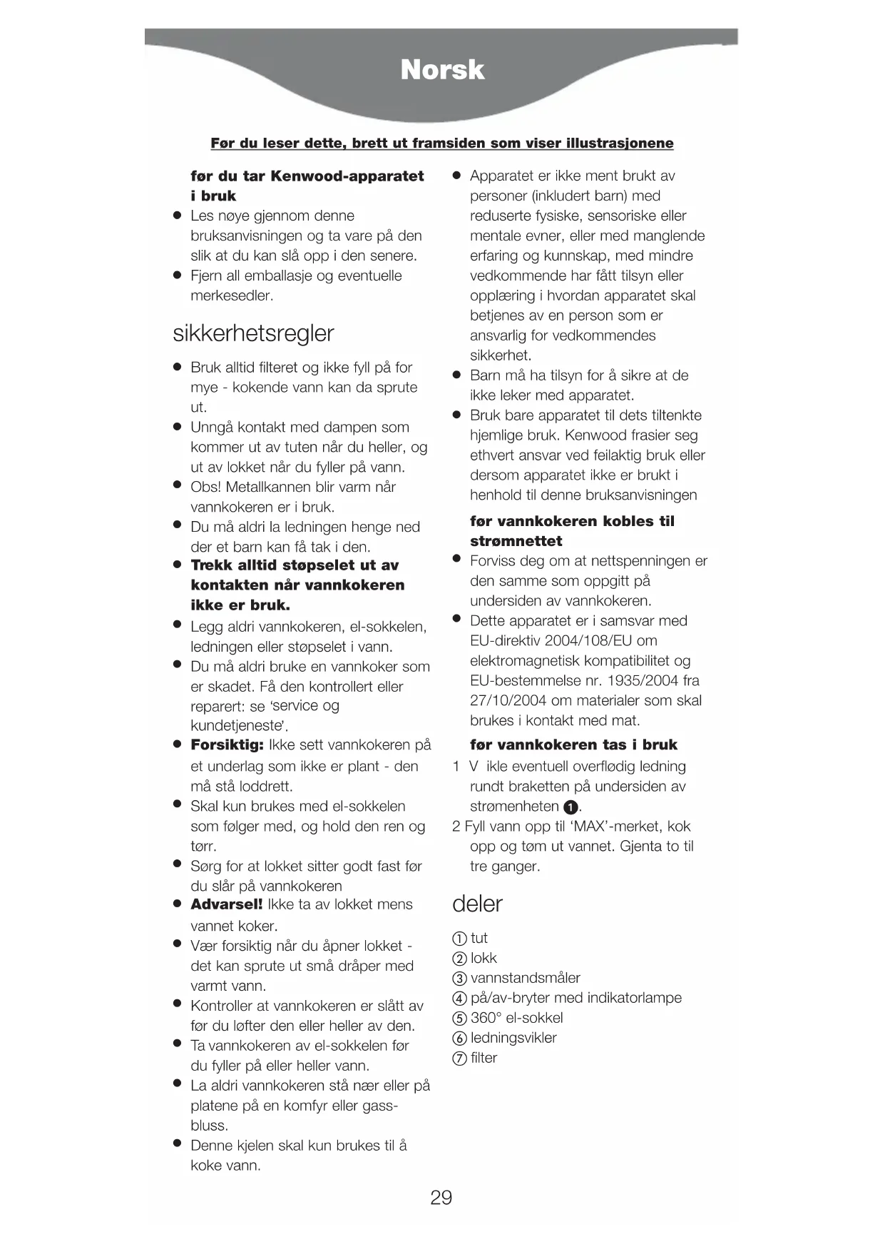 Bruk bare apparatet til dets tiltenkte hjemlige bruk. Kenwood frasier seg ethvert ansvar ved feilaktig bruk eller dersom apparatet ikke er brukt i henhold til denne bruksanvisningen før vannkokeren kobles til strømnettet