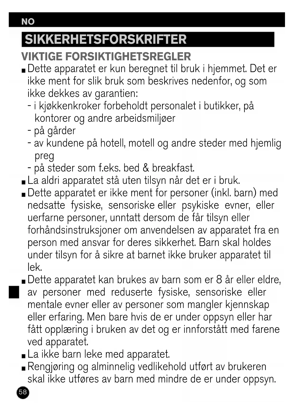 VIKTIGE FORSIKTIGHETSREGLER Dette apparatet er kun beregnet til bruk i hjemmet. Det er ikke ment for slik bruk som beskrives nedenfor, og som ikke dekkes av garantien: - i kjøkkenkroker forbeholdt personalet i butikker, på kontorer og andre arbeidsmiljøer - på gårder - av kundene på hotell, motell og andre steder med hjemlig preg - på steder som f.eks. bed & breakfast. La aldri apparatet stå uten tilsyn når det er i bruk. Dette apparatet er ikke ment for personer (inkl. barn) med nedsatte fysiske, sensoriske eller psykiske evner, eller uerfarne personer, unntatt dersom de får tilsyn eller forhåndsinstruksjoner om anvendelsen av apparatet fra en person med ansvar for deres sikkerhet. Barn skal holdes under tilsyn for å sikre at barnet ikke bruker apparatet til lek. Dette apparatet kan brukes av barn som er 8 år eller eldre, av personer med reduserte fysiske, sensoriske eller mentale evner eller av personer som mangler kjennskap eller erfaring. Men bare hvis de er under oppsyn eller har fått opplæring i bruken av det og er innforstått med farene ved apparatet. La ikke barn leke med apparatet. Rengjøring og alminnelig vedlikehold utført av brukeren skal ikke utføres av barn med mindre de er under oppsyn. SIKKERHETSFORSKRIFTER KRPS-GRILPLANCH-2100075680 19/02/13 11:41 Page5859