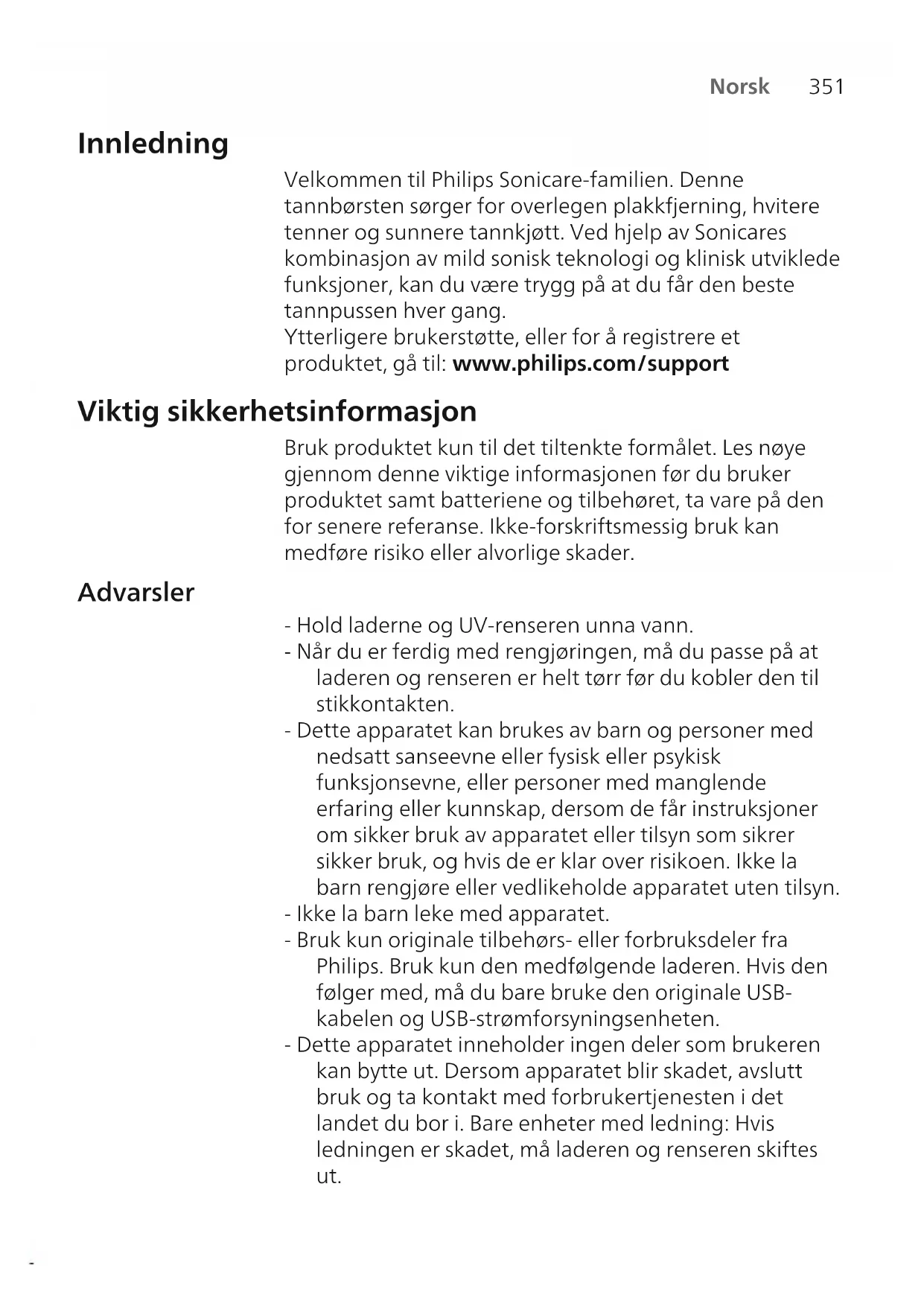 Norsk Innledning Velkommen til Philips Sonicare-familien. Denne tannbørsten sørger for overlegen plakkfjerning, hvitere tenner og sunnere tannkjøtt. Ved hjelp av Sonicares kombinasjon av mild sonisk teknologi og klinisk utviklede funksjoner, kan du være trygg på at du får den beste tannpussen hver gang. Ytterligere brukerstøtte, eller for å registrere et produktet, gå til: www.philips.com/support Viktig sikkerhetsinformasjon Bruk produktet kun til det tiltenkte formålet. Les nøye gjennom denne viktige informasjonen før du bruker produktet samt batteriene og tilbehøret, ta vare på den for senere referanse. Ikke-forskriftsmessig bruk kan medføre risiko eller alvorlige skader. Advarsler - Hold laderne og UV-renseren unna vann. - Når du er ferdig med rengjøringen, må du passe på at laderen og renseren er helt tørr før du kobler den til stikkontakten. - Dette apparatet kan brukes av barn og personer med nedsatt sanseevne eller fysisk eller psykisk funksjonsevne, eller personer med manglende erfaring eller kunnskap, dersom de får instruksjoner om sikker bruk av apparatet eller tilsyn som sikrer sikker bruk, og hvis de er klar over risikoen. Ikke la barn rengjøre eller vedlikeholde apparatet uten tilsyn. - Ikke la barn leke med apparatet. - Bruk kun originale tilbehørs- eller forbruksdeler fra Philips. Bruk kun den medfølgende laderen. Hvis den følger med, må du bare bruke den originale USB- kabelen og USB-strømforsyningsenheten. - Dette apparatet inneholder ingen deler som brukeren kan bytte ut. Dersom apparatet blir skadet, avslutt bruk og ta kontakt med forbrukertjenesten i det landet du bor i. Bare enheter med ledning: Hvis ledningen er skadet, må laderen og renseren skiftes ut.352 Norsk - Ikke bruk laderen eller renseren utendørs, eller i nærheten av varme overflater. - Ikke vask noen av produktets deler i oppvaskmaskinen. - Dette apparatet er utformet for rengjøring av tenner, tannkjøtt og tunge. - Hold sanitereren utenfor rekkevidden av barn til enhver tid. - Slutt å bruke renseren hvis UV-lyspæren forblir på når døren er åpen. UV-lys kan være skadelig for øyne og hud. - Bruk kun desinfiseringsenheten når beskyttelsesskjermen er på plass. - Ikke ta på UV-lyspæren på UV-renseren når den er varm. - Ikke bruk børstehoder med knekte eller bøyde hår. Skift børstehode hver tredje måned eller tidligere hvis du ser tegn på slitasje. - Unngå direkte kontakt med produkter som inneholder essensielle oljer eller kokosolje. Ved kontakt kan børstehår løsne. - Slutt å bruke apparatet og rådfør deg med tannlegen/legen din dersom det oppstår for mye blødning etter bruk, dersom blødningen vedvarer etter 1 ukes bruk eller hvis du opplever ubehag eller smerte. - Ta kontakt med tannlegen før du bruker apparatet hvis du har hatt operasjoner i tannkjøttet eller andre deler av munnen i løpet av de siste to månedene. - Hvis du har pacemaker eller en annen implantert enhet, bør du ta kontakt med legen eller produsenten av den implanterte enheten før bruk. - Ta kontakt med lege før du bruker apparatet hvis du har medisinske bekymringer. - Dette apparatet er beregnet på personlig tannhygiene. Den er ikke laget for bruk på flere pasienter på et tannlegekontor eller en institusjon. Sikkerhetsinstruksjoner for batteri - Dette apparatet inneholder batterier som bare må byttes ut av en person med opplæring353 Norsk - Bruk produktet kun til det tiltenkte formålet. Les nøye gjennom denne informasjonen før du bruker produktet samt batteriene og tilbehøret, ta vare på den for senere referanse. Ikke-forskriftsmessig bruk kan medføre risiko eller alvorlige skader. Tilbehøret som følger med, kan variere for de ulike produktene. - Bruk kun originale tilbehørs- eller forbruksartikler fra Philips. Bruk kun den avtakbare tilførselsenheten TCBxxxx, HX6100, HX6110, HX6160 eller WAAxxxx. - Hold produktet og batteriene unna ild, og ikke utsett dem for direkte sollys eller høye temperaturer. - Hvis produktet blir unormalt varmt, avgir lukt, endrer farge eller tar unormalt lang tid å lade, avbryter du bruken og oppladningen og kontakter nærmeste Philips-forhandler. - Ikke plasser produkter og batterier i mikrobølgeovn eller på en induksjonskokeplate. - Ikke forsøk å åpne, utføre endringer på, stikke hull på, skade eller demontere produktet eller batteriet, da dette kan føre til at batteriet overopphetes eller slipper ut giftige eller farlige stoffer. Unngå kortslutning, overlading og omvendt lading av batteriene. - Dette apparatet inneholder batterier som ikke kan byttes. Når batteriet er på slutten av levetiden, skal apparatet kasseres på en ordentlig måte. Se delen om resirkulering. - Hvis batteriene er skadet eller lekker, må du passe på at du ikke får batterivæske på huden eller i øynene. Hvis dette skulle skje, må du øyeblikkelig skylle godt med vann og kontakte lege. - Pass på at du er tørr på hendene og at produktet og batteriene er i tørr stand når du håndterer batteriene. - Ikke la batteripolene på de fjernede batteriene komme i kontakt med metallgjenstander (f.eks. mynter, hårnåler, ringer), da dette kan føre til at batteriene kortsluttes. Ikke pakk inn batteriene i aluminiumsfolie. Teip over batteripolene eller legg batteriene i en plastpose før du kasserer dem. - Lad opp og bruk produktet ved en temperatur på mellom 0 °C og 40 °C.354 Norsk Lagring og transport Temperatur på -10°C til 60°C. Elektromagnetiske felt (EMF) Dette Philips-apparatet overholder alle aktuelle standarder og forskrifter for eksponering for elektromagnetiske felt. Instrukser for radioutstyr Philips erklærer herved at den elektriske tannbørsten med radioutstyrstype (Bluetooth, NFC) er i samsvar med direktiv 2014/53/EU. - Bluetooth radiofrekvensgrensesnittet i relevante produkt opererer ved 2,4 GHz. - Maksimal utgangskraft fra Bluetooth-apparatet er 3 dBm. - NFC radiofrekvensgrensesnittet i relevante produkt opererer ved 13,56 MH
