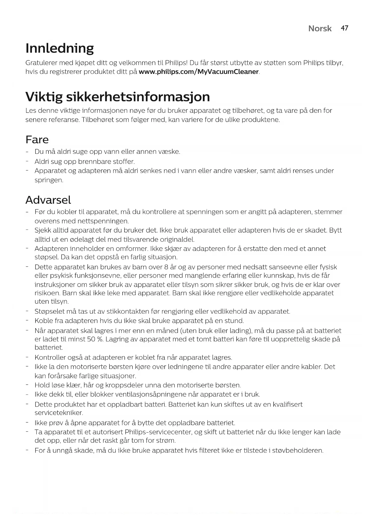 Norsk Innledning Gratulerer med kjøpet ditt og velkommen til Philips! Du får størst utbytte av støtten som Philips tilbyr, hvis du registrerer produktet ditt på www.philips.com/MyVacuumCleaner. Viktig sikkerhetsinformasjon Les denne viktige informasjonen nøye før du bruker apparatet og tilbehøret, og ta vare på den for senere referanse. Tilbehøret som følger med, kan variere for de ulike produktene. Fare