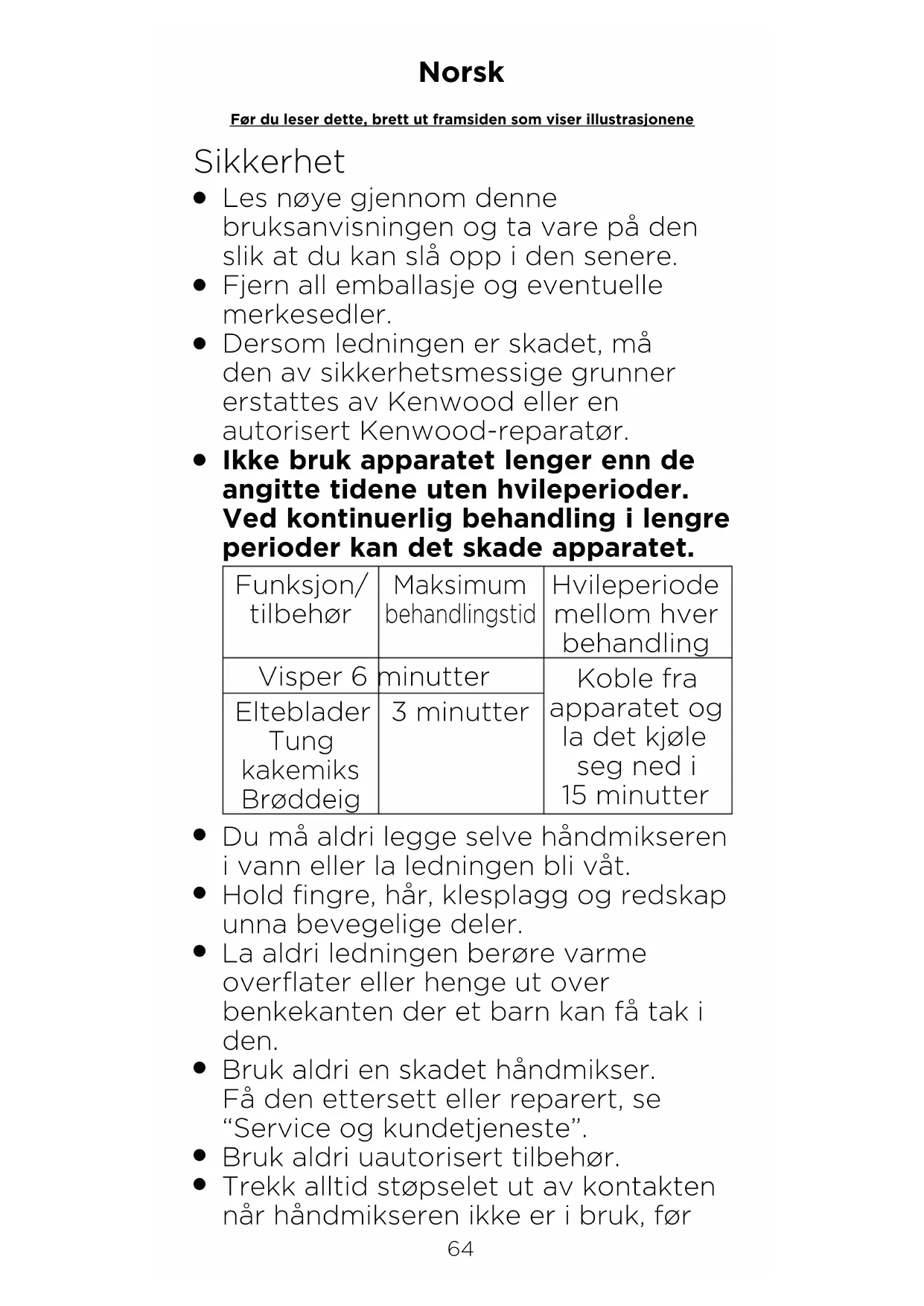 Trekk alltid støpselet ut av kontakten når håndmikseren ikke er i bruk, før Før du leser dette, brett ut framsiden som viser illustrasjonene Norsk65 Før du bruker håndmikseren for første gang