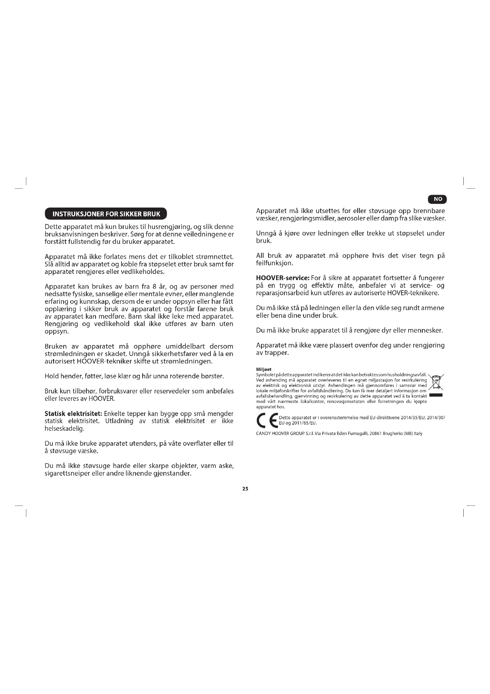 Dette apparatet må kun brukes til husrengjøring, og slik denne bruksanvisningen beskriver. Sørg for at denne veiledningene er forstått fullstendig før du bruker apparatet. Apparatet må ikke forlates mens det er tilkoblet strømnettet. Slå alltid av apparatet og koble fra støpselet etter bruk samt før apparatet rengjøres eller vedlikeholdes. Apparatet kan brukes av barn fra 8 år, og av personer med nedsatte fysiske, sanselige eller mentale evner, eller manglende erfaring og kunnskap, dersom de er under oppsyn eller har fått opplæring i sikker bruk av apparatet og forstår farene bruk av apparatet kan medføre. Barn skal ikke leke med apparatet. Rengjøring og vedlikehold skal ikke utføres av barn uten oppsyn. Bruken av apparatet må opphøre umiddelbart dersom strømledningen er skadet. Unngå sikkerhetsfarer ved å la en autorisert HOOVER-tekniker skifte ut strømledningen. Hold hender, føtter, løse klær og hår unna roterende børster. Bruk kun tilbehør, forbruksvarer eller reservedeler som anbefales eller leveres av HOOVER. Statisk elektrisitet: Enkelte tepper kan bygge opp små mengder statisk elektrisitet. Utladning av statisk elektrisitet er ikke helseskadelig. Du må ikke bruke apparatet utendørs, på våte overater eller til å støvsuge væske. Du må ikke støvsuge harde eller skarpe objekter, varm aske, sigarettsneiper eller andre liknende gjenstander. Apparatet må ikke utsettes for eller støvsuge opp brennbare væsker, rengjøringsmidler, aerosoler eller damp fra slike væsker. Unngå å kjøre over ledningen eller trekke ut støpselet under bruk. All bruk av apparatet må opphøre hvis det viser tegn på feilfunksjon. HOOVER-service: For å sikre at apparatet fortsetter å fungerer på en trygg og eektiv måte, anbefaler vi at service- og reparasjonsarbeid kun utføres av autoriserte HOVER-teknikere. Du må ikke stå på ledningen eller la den vikle seg rundt armene eller bena dine under bruk. Du må ikke bruke apparatet til å rengjøre dyr eller mennesker. Apparatet må ikke være plassert ovenfor deg under rengjøring av trapper. Miljøet Symbolet på dette apparatet indikerer at det ikke kan betraktes som husholdningsavfall. Ved avhending må apparatet overleveres til en egnet miljøstasjon for resirkulering av elektrisk og elektronisk utstyr. Avhendingen må gjennomføres i samsvar med lokale miljøforskrifter for avfallshåndtering. Du kan få mer detaljert informasjon om avfallsbehandling, gjenvinning og resirkulering av dette apparatet ved å ta kontakt med vårt nærmeste lokalkontor, renovasjonsetaten eller forretningen du kjøpte apparatet hos. Dette apparatet er i overensstemmelse med EU-direktivene 2014/35/EU, 2014/30/ EU og 2011/65/EU. CANDY HOOVER GROUP S.r.l. Via Privata Eden Fumagalli, 20861 Brugherio (MB) Italy26