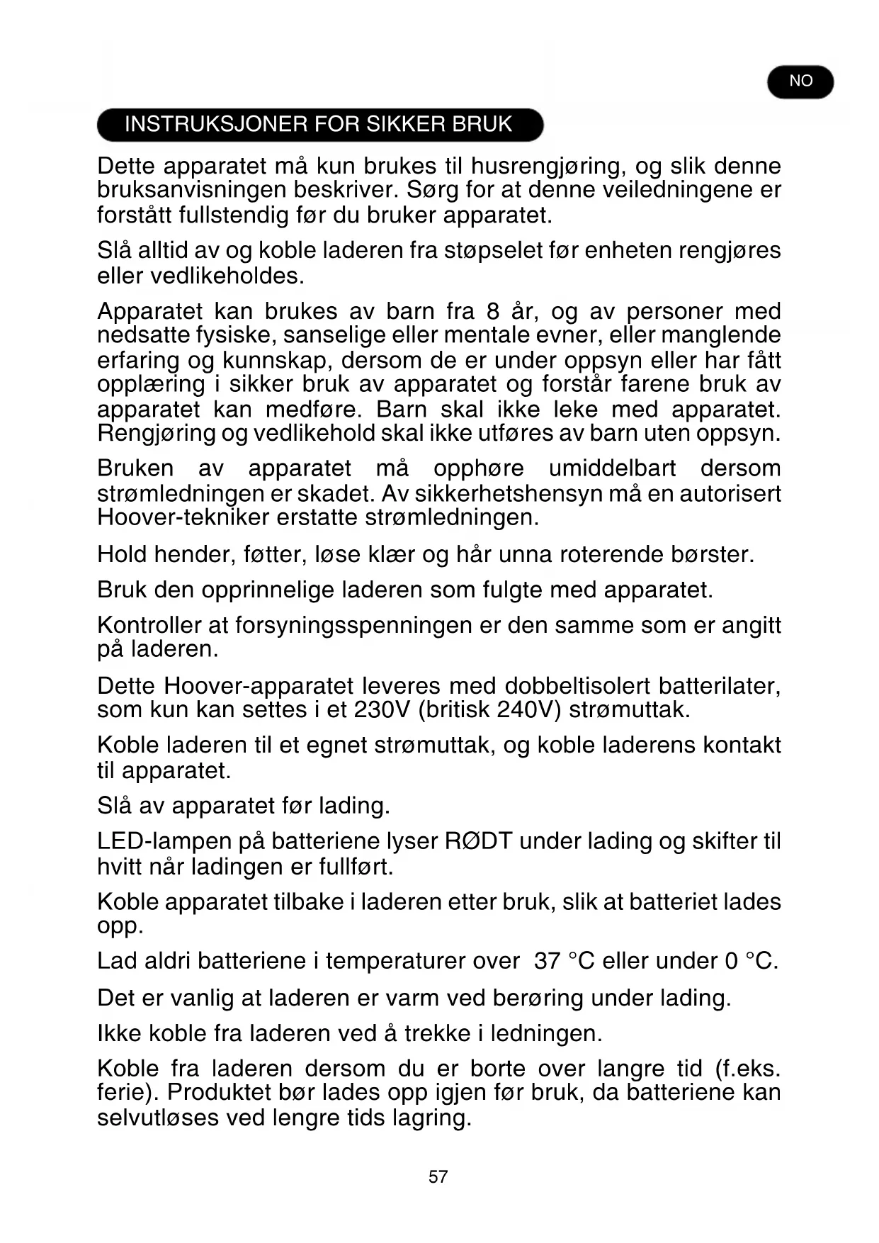 Dette apparatet må kun brukes til husrengjøring, og slik denne bruksanvisningen beskriver. Sørg for at denne veiledningene er forstått fullstendig før du bruker apparatet. Slå alltid av og koble laderen fra støpselet før enheten rengjøres eller vedlikeholdes. Apparatet kan brukes av barn fra 8 år, og av personer med nedsatte fysiske, sanselige eller mentale evner, eller manglende erfaring og kunnskap, dersom de er under oppsyn eller har fått opplæring i sikker bruk av apparatet og forstår farene bruk av apparatet kan medføre. Barn skal ikke leke med apparatet. Rengjøring og vedlikehold skal ikke utføres av barn uten oppsyn. Bruken av apparatet må opphøre umiddelbart dersom strømledningen er skadet. Av sikkerhetshensyn må en autorisert Hoover-tekniker erstatte strømledningen. Hold hender, føtter, løse klær og hår unna roterende børster. Bruk den opprinnelige laderen som fulgte med apparatet. Kontroller at forsyningsspenningen er den samme som er angitt på laderen. Dette Hoover-apparatet leveres med dobbeltisolert batterilater, som kun kan settes i et 230V (britisk 240V) strømuttak. Koble laderen til et egnet strømuttak, og koble laderens kontakt til apparatet. Slå av apparatet før lading. LED-lampen på batteriene lyser RØDT under lading og skifter til hvitt når ladingen er fullført. Koble apparatet tilbake i laderen etter bruk, slik at batteriet lades opp. Lad aldri batteriene i temperaturer over 37 °C eller under 0 °C. Det er vanlig at laderen er varm ved berøring under lading. Ikke koble fra laderen ved å trekke i ledningen. Koble fra laderen dersom du er borte over langre tid (f.eks. ferie). Produktet bør lades opp igjen før bruk, da batteriene kan selvutløses ved lengre tids lagring. NO58 Hvis apparatet skal avhendes, bør batteriene fjernes først. Apparatet må være frakoblet strømnettet når du fjerner batteriet. Kast batteriene på en trygg måte. La apparatet gå til den stopper fordi batteriene er helt tømt. Brukte batterier bør leveres til en gjenbruksstasjon, og ikke kastes sammen med husholdningsavfall. For å fjerne batteriene, bør du kontakte Hoovers kundesenter, eller fortsette som anvist nedenfor: VIKTIG: Tøm alltid batteriene helt før fjerning, og kontroller at laderen er koblet fra. La rengjøringsapparatet gå til batteriene er helt tømt. Ta laderkontakten ut av apparatet. Trykk på knappene som frigjør batteripakken og dra den ut. Merk: Hvis du har vanskeligheter med å demontere enheten eller ønsker mer detaljert informasjon om behandling, gjenvinning og resirkulering av apparatet, ta kontakt med kommunen eller renovasjonsselskapet. Bruk kun tilbehør, forbruksvarer eller reservedeler som anbefales eller leveres av Hoover. Statisk elektrisitet: Enkelte tepper kan bygge opp små mengder statisk elektrisitet. Utladning av statisk elektrisitet er ikke helseskadelig. Du må ikke bruke apparatet utendørs, på våte overflater eller til å støvsuge væske. Du må ikke støvsuge harde eller skarpe objekter, varm aske, sigarettsneiper eller andre liknende gjenstander. Apparatet må ikke utsettes for eller støvsuge opp brennbare væsker, rengjøringsmidler, aerosoler eller damp fra slike væsker. Unngå å kjøre over ledningen eller trekke ut støpselet under bruk. Ikke fortsett å bruke rengjøringsapparatet eller laderen hvis det virker som om det er noe feil med dem. Hoover-service: For å sikre at apparatet fortsatt virker som det skal, og er trygt å bruke, anbefaler vi at all service og alle reparasjoner blir utført av en autorisert Hoover-tekniker. Du må ikke bruke apparatet til å rengjøre dyr eller mennesker. NOPRODUKTKOMPONENTER