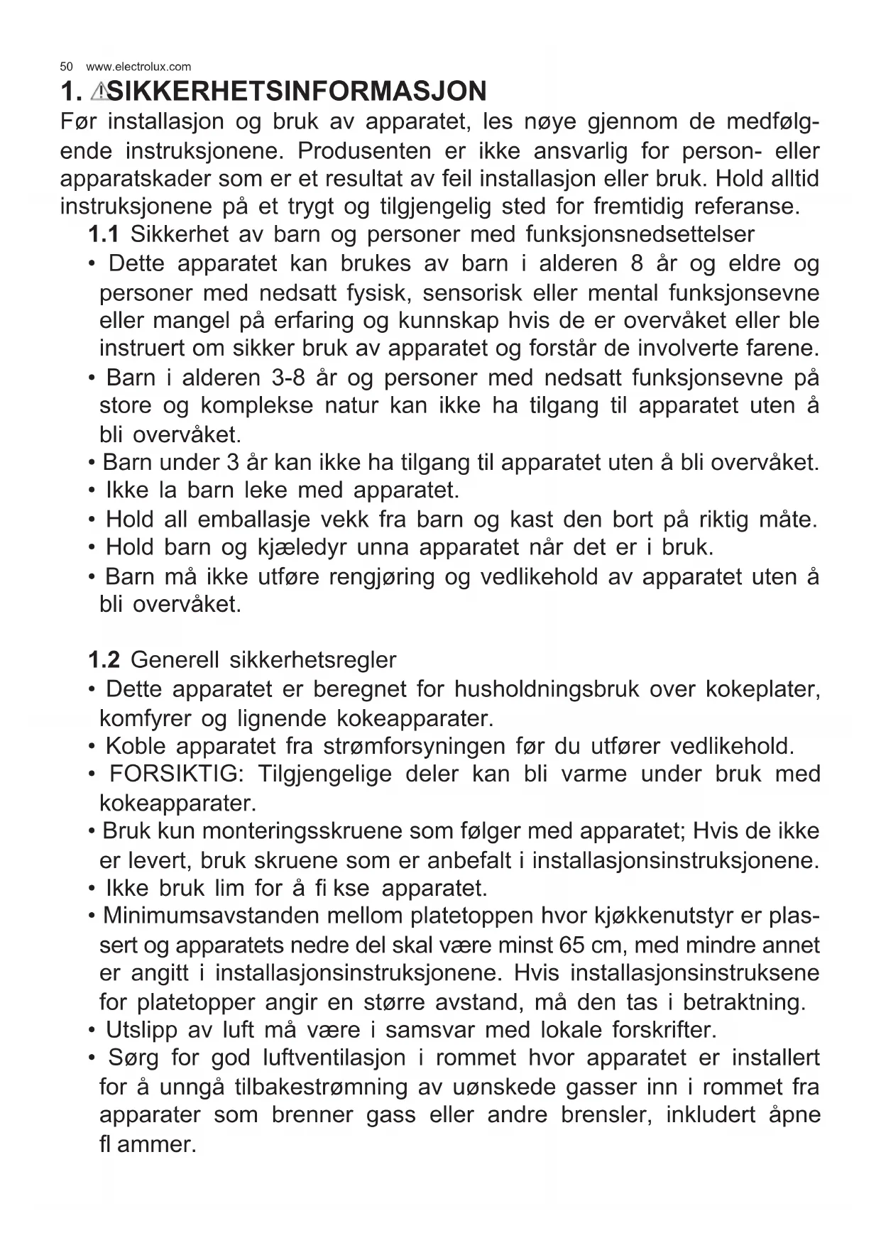 - Sørg for god luftventilasjon i rommet hvor apparatet er installert for å unngå tilbakestrømning av uønskede gasser inn i rommet fra apparater som brenner gass eller andre brensler, inkludert åpne fl ammer.51 NORSK