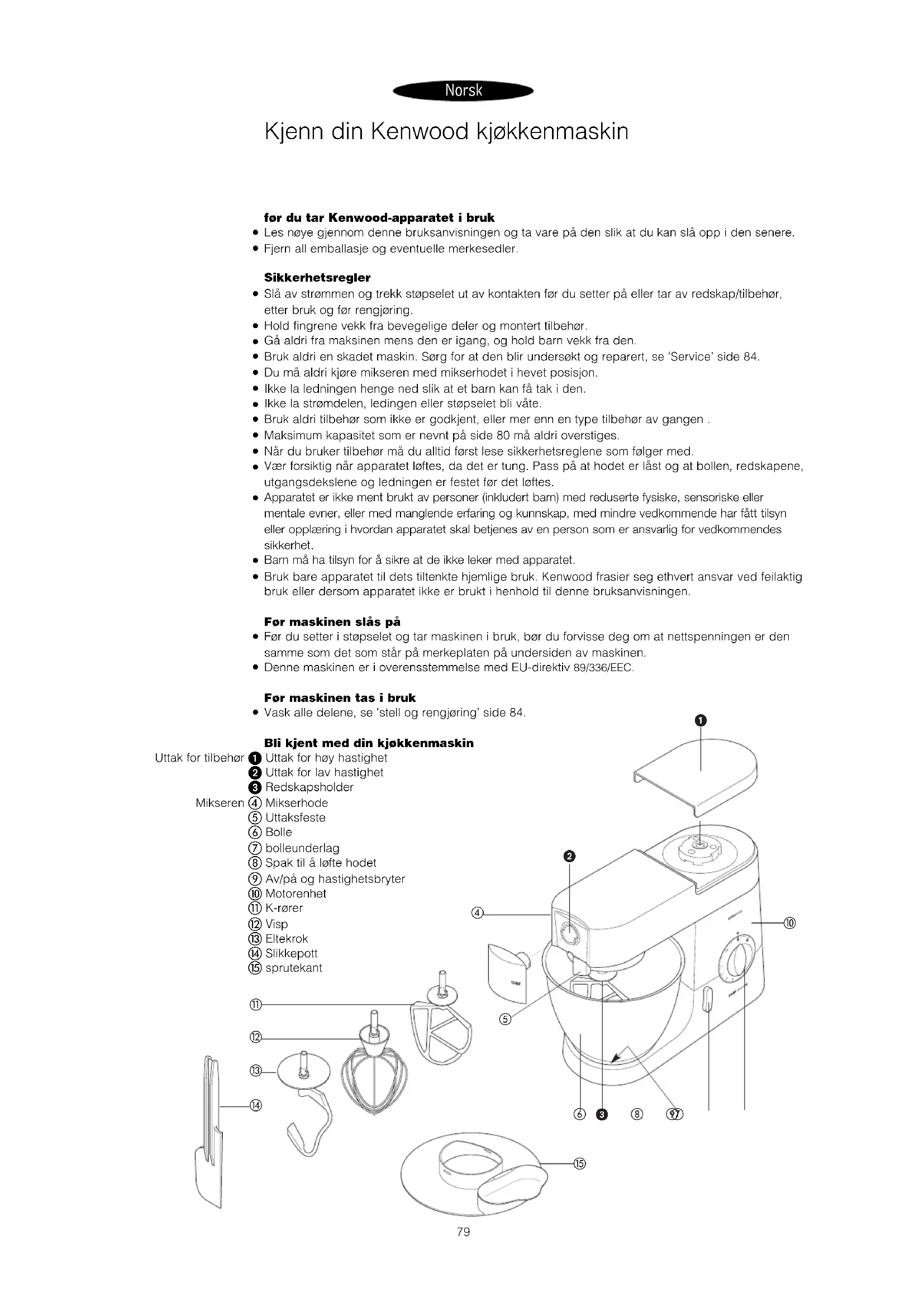 Vask alle delene, se ‘stell og rengjøring’ side 84. Bli kjent med din kjøkkenmaskin Uttak for tilbehør Uttak for høy hastighet Uttak for lav hastighet Redskapsholder Mikseren Mikserhode Uttaksfeste Bolle bolleunderlag Spak til å løfte hodet Av/på og hastighetsbryter Motorenhet K-rører Visp Eltekrok Slikkepott sprutekant Kjenn din Kenwood kjøkkenmaskin