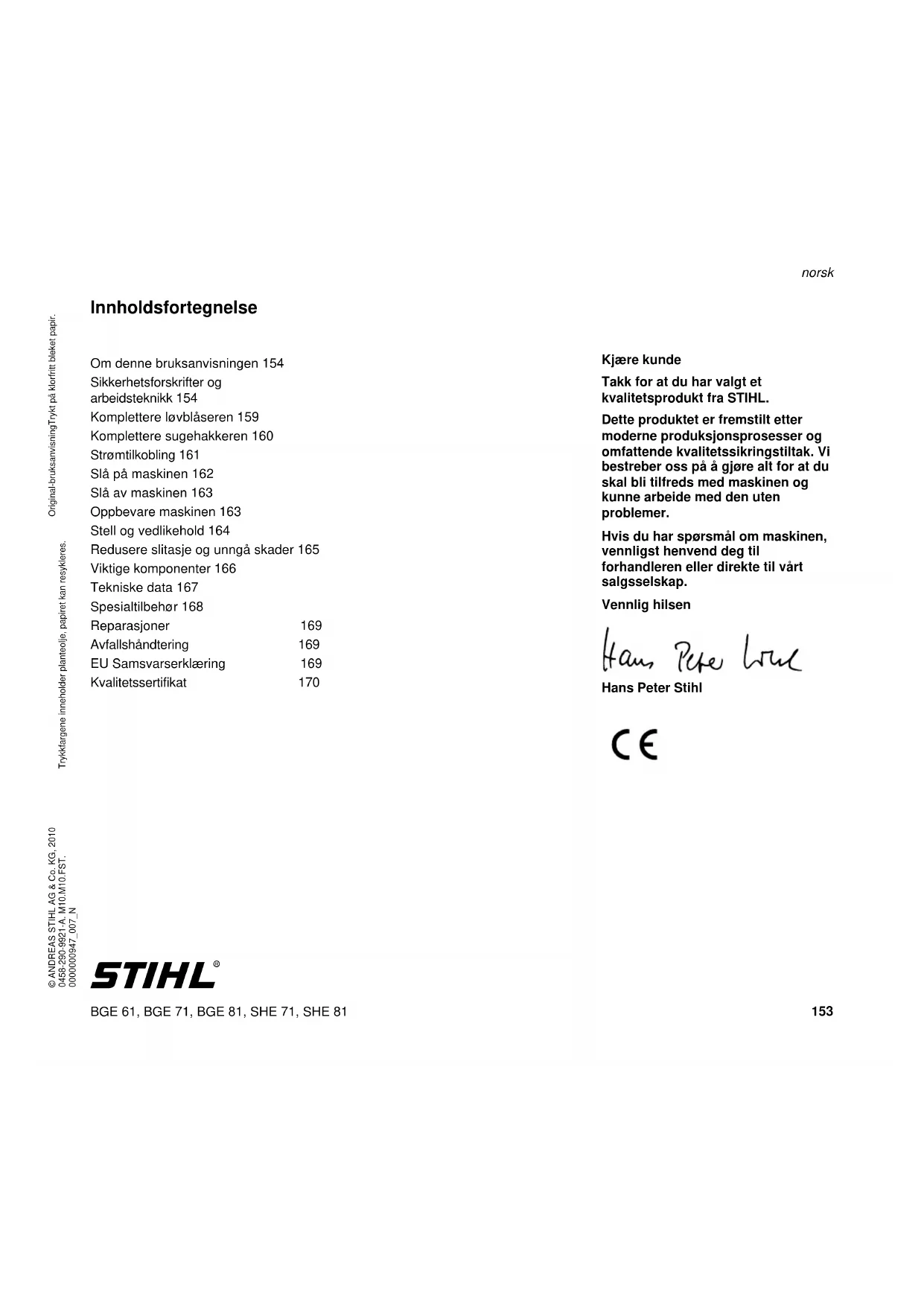 Innholdsfortegnelse Kjære kunde Takk for at du har valgt et kvalitetsprodukt fra STIHL. Dette produktet er fremstilt etter moderne produksjonsprosesser og omfattende kvalitetssikringstiltak. Vi bestreber oss på å gjøre alt for at du skal bli tilfreds med maskinen og kunne arbeide med den uten problemer. Hvis du har spørsmål om maskinen, vennligst henvend deg til forhandleren eller direkte til vårt salgsselskap. Vennlig hilsen Hans Peter Stihl Om denne bruksanvisningen 154 Sikkerhetsforskrifter og arbeidsteknikk 154 Komplettere løvblåseren 159 Komplettere sugehakkeren 160 Strømtilkobling 161 Slå på maskinen 162 Slå av maskinen 163 Oppbevare maskinen 163 Stell og vedlikehold 164 Redusere slitasje og unngå skader 165 Viktige komponenter 166 Tekniske data 167 Spesialtilbehør 168 Reparasjoner 169 Avfallshåndtering 169 EU Samsvarserklæring 169 Kvalitetssertifikat 170BGE 61, BGE 71, BGE 81, SHE 71, SHE 81 norsk
