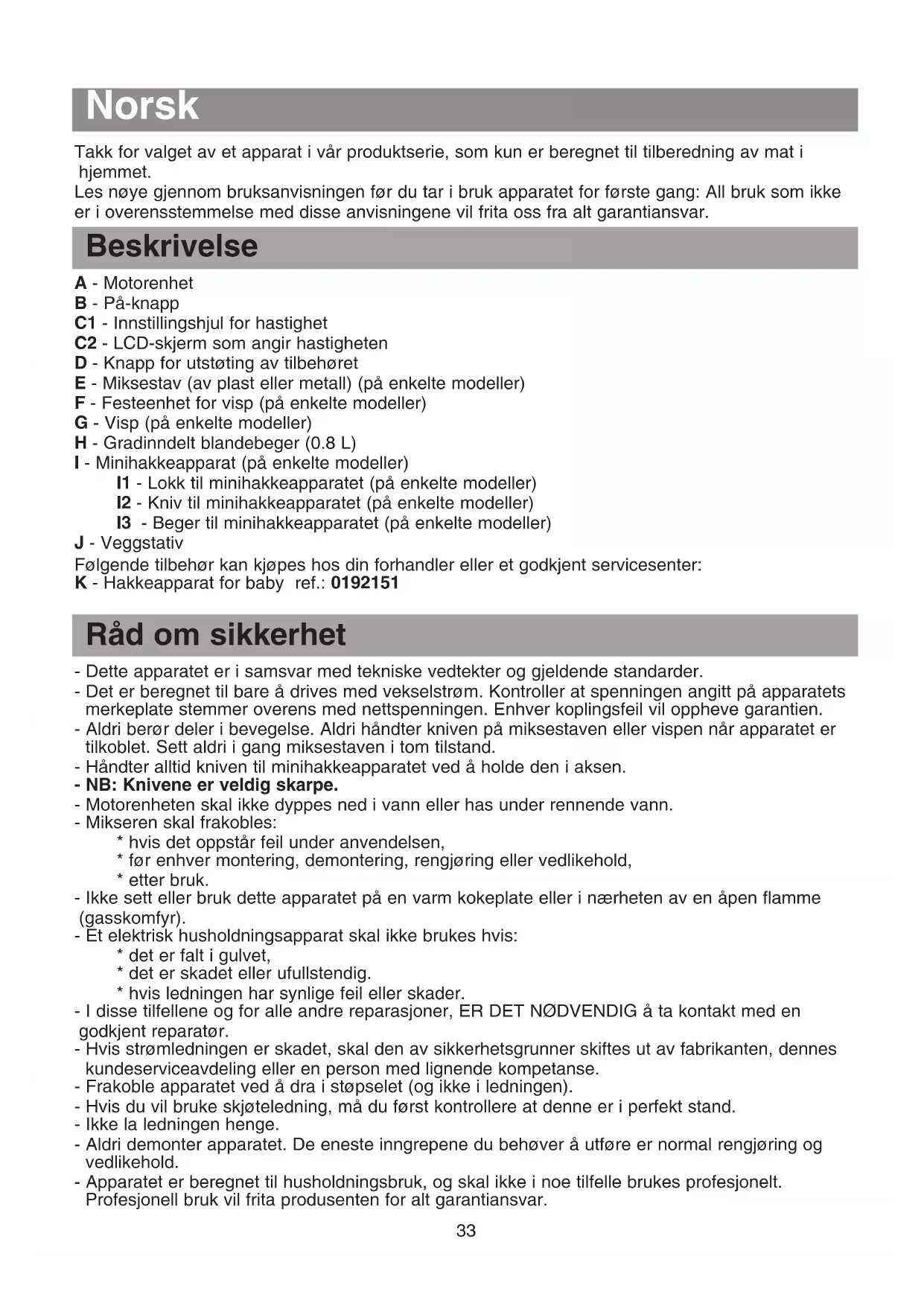 - hvis ledningen har synlige feil eller skader. - I disse tilfellene og for alle andre reparasjoner, ER DET NØDVENDIG å ta kontakt med en godkjent reparatør. - Hvis strømledningen er skadet, skal den av sikkerhetsgrunner skiftes ut av fabrikanten, dennes kundeserviceavdeling eller en person med lignende kompetanse. - Frakoble apparatet ved å dra i støpselet (og ikke i ledningen). - Hvis du vil bruke skjøteledning, må du først kontrollere at denne er i perfekt stand. - Ikke la ledningen henge. - Aldri demonter apparatet. De eneste inngrepene du behøver å utføre er normal rengjøring og vedlikehold. - Apparatet er beregnet til husholdningsbruk, og skal ikke i noe tilfelle brukes profesjonelt. Profesjonell bruk vil frita produsenten for alt garantiansvar. hanovre 2544615 6/04/06 14:33 Page 3334 - Apparatet skal ikke brukes uten hjelp eller tilsyn av personer som av fysiske, sensoriske eller mentale grunner ikke gjør dem i stand til å bruke det uten at de utsettes for fare. - Dette apparatet er ingen leke, og mikseren må aldri brukes uten tilsyn hvis det er barn i nærheten. Ikke lek med apparatet. - Ikke bruk miksestaven eller vispen i begeret til minihakkeapparatet. Igangsetting Før du tar i bruk apparatet for første gang, må du vaske tilbehøret med vann og oppvaskmiddel. Skyll av og tørk det nøye. Forsiktig: Knivbladene er veldig skarpe. Bruk av miksestaven: Før staven (E) inn i motorenheten (A) til du hører et « låseklikk ». Mikseren egner seg utmerket til å tilberede sauser, supper, cocktailer, milkshaker, majoneser, pannekakerøre, vaffelkakerøre og babymat. For å unngå sprut setter du først miksestaven ned i tilberedningen, og så setter du apparatets støpsel i veggkontakten og trykker på På-knappen (B). Juster hastighet ved hjelp av hjulet (C1). Du kan se hastigheten på LCD-skjermen (C2). Foreta en rotasjonsbevegelse nedenfra og opp slik at maten blandes bedre. Etter bruk, tar du apparatets støpsel ut av veggkontakten, og trykker deretter på utstøtingsknappen (D) for å demontere miksestavtilbehøret. Bruk av vispen: Sett vispen (G) inn i festeenheten (F), og føy disse inn i motorenheten (A) til du hører et låseklikk. Du kan bruke vispen til å lage tynne tilberedninger (pannekakerøre, stivpiskede eggehviter, pisket krem, osv.). Sett apparatets støpsel i veggkontakten og trykk på På-knappen (B). Juster hastighet ved hjelp av hjulet (C1). Du kan se hastigheten på LCD-skjermen (C2). Etter at du har tatt apparatets støpsel ut av veggkontakten, trykker du på utstøtingsknappen (D) for å demontere vispetilbehøret. Bruk av minihakkeapparatet: Før du tar i bruk minihakkeapparatet: 1 – Sett kniven (I2) (uten knivbladbeskyttelsen) forsiktig i begeret (I3) på midtaksen. Ikke glem å sette på beskyttelsen igjen når du er ferdig med tilberedningen. 2 – Ha ingrediensene i begeret. 3 – Plasser lokket (I1) og sett deretter motorenheten (A) på lokket (I1).