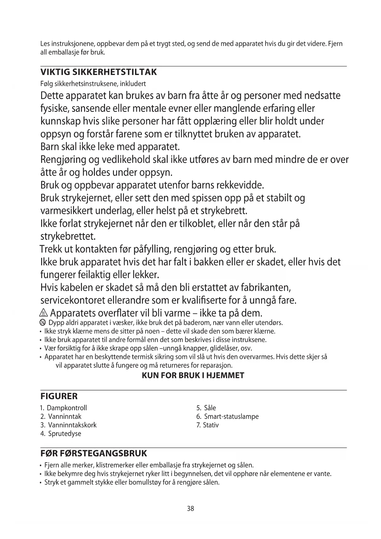AE38 Les instruksjonene, oppbevar dem på et trygt sted, og send de med apparatet hvis du gir det videre. Fjern all emballasje før bruk. VIKTIG SIKKERHETSTILTAK Følg sikkerhetsinstruksene, inkludert Dette apparatet kan brukes av barn fra åtte år og personer med nedsatte fysiske, sansende eller mentale evner eller manglende erfaring eller kunnskap hvis slike personer har fått opplæring eller blir holdt under oppsyn og forstår farene som er tilknyttet bruken av apparatet. Barn skal ikke leke med apparatet. Rengjøring og vedlikehold skal ikke utføres av barn med mindre de er over åtte år og holdes under oppsyn. Bruk og oppbevar apparatet utenfor barns rekkevidde. Bruk strykejernet, eller sett den med spissen opp på et stabilt og varmesikkert underlag, eller helst på et strykebrett. Ikke forlat strykejernet når den er tilkoblet, eller når den står på strykebrettet. Trekk ut kontakten før påfylling, rengjøring og etter bruk. Ikke bruk apparatet hvis det har falt i bakken eller er skadet, eller hvis det fungerer feilaktig eller lekker. Hvis kabelen er skadet så må den bli erstattet av fabrikanten, servicekontoret ellerandre som er kvaliserte for å unngå fare. h Apparatets overater vil bli varme – ikke ta på dem. b Dypp aldri apparatet i væsker, ikke bruk det på baderom, nær vann eller utendørs.