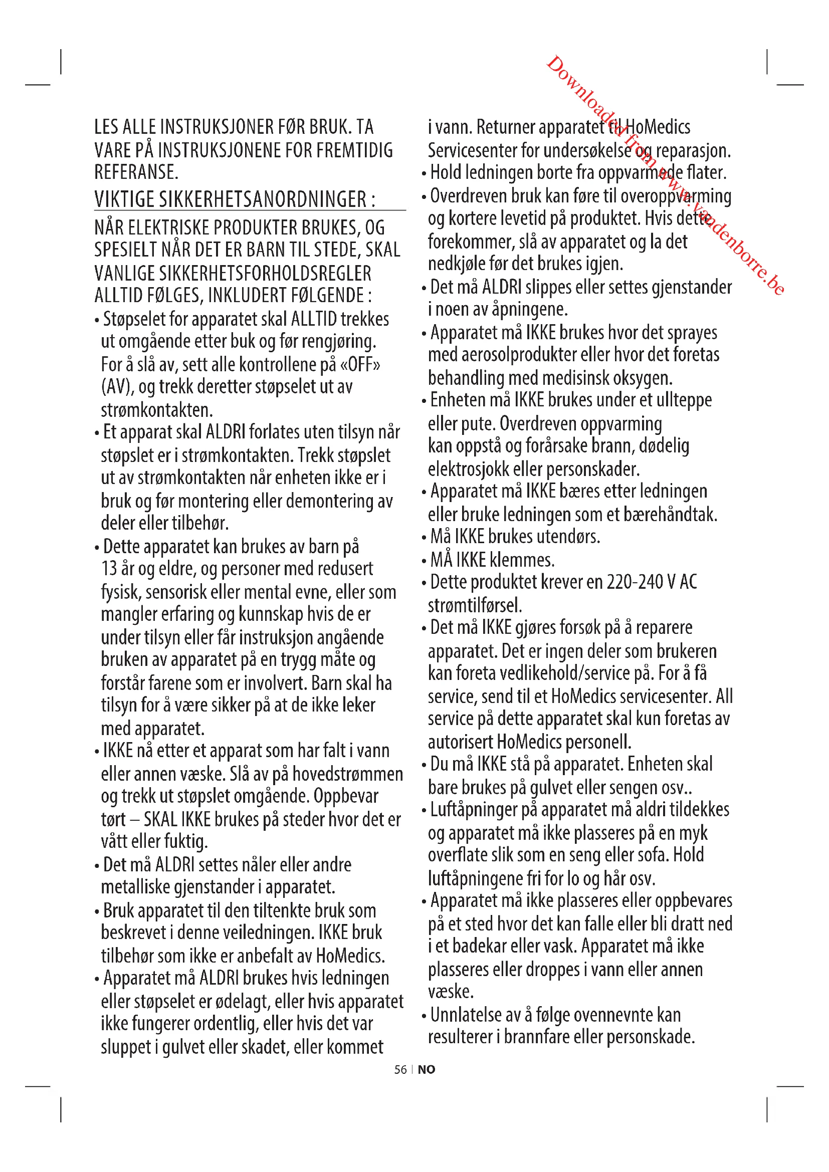 - Apparatet må ALDRI brukes hvis ledningen eller støpselet er ødelagt, eller hvis apparatet ikke fungerer ordentlig, eller hvis det var sluppet i gulvet eller skadet, eller kommet i vann. Returner apparatet til HoMedics Servicesenter for undersøkelse og reparasjon.