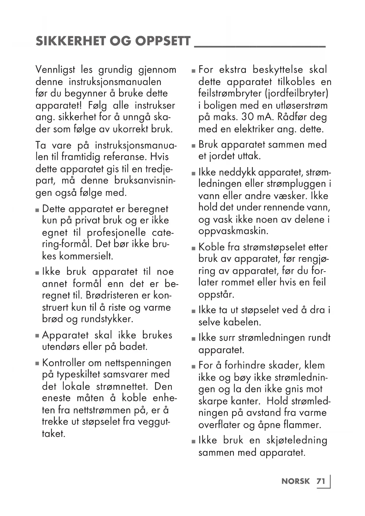 fjærer tilbake oppover og skivene av ristet brød kan tas ut av brødristeren.76 NORSK DRIFT ____________________________________ Forsiktig